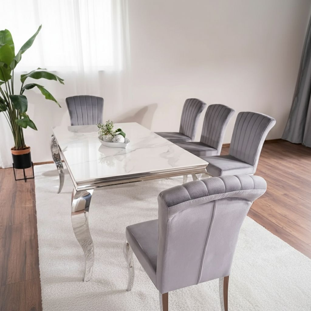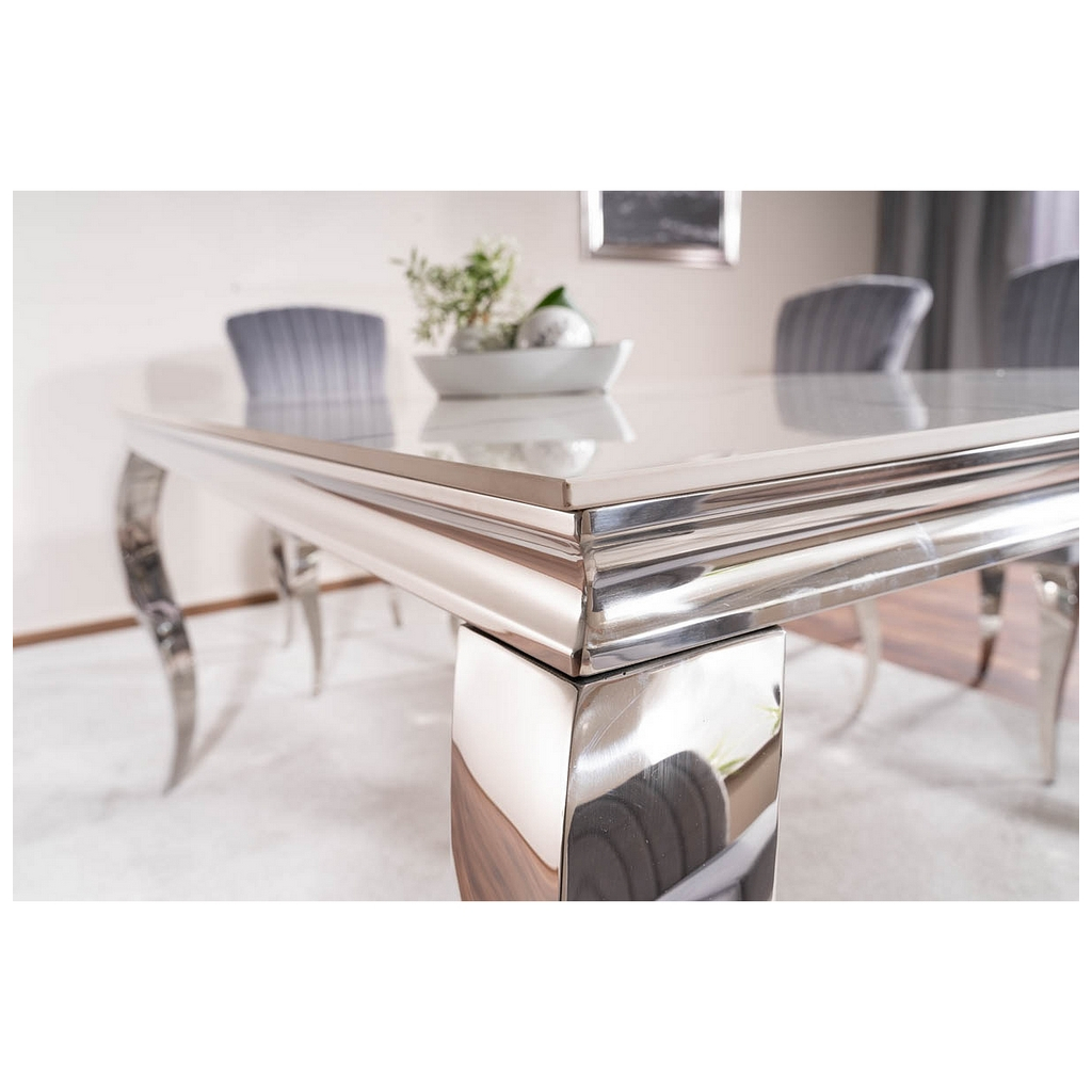 Kontrastující nohy z nerezové oceli s rafinovanými křivkami nejen podtrhují moderní estetiku stolu, ale také zajišťují jeho stabilitu a pevnost. Dohromady celek připomíná nábytek šlechtického sídla.