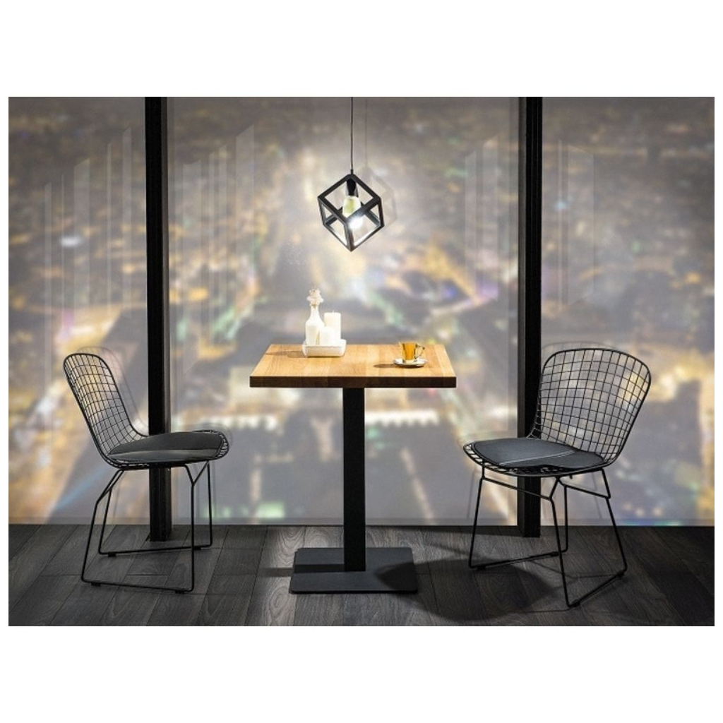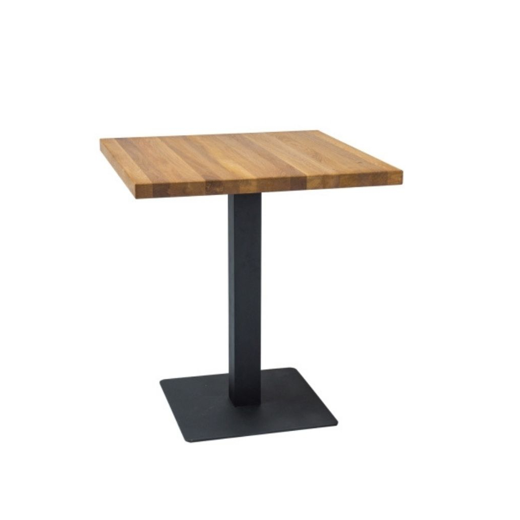 Čtvercová deska stolu je vyrobena z masivního dřeva v dekoru přírodní dub, noha stolu je z pevného černého kovu, stabilitu zajišťuje její rozšíření ve spodní části.