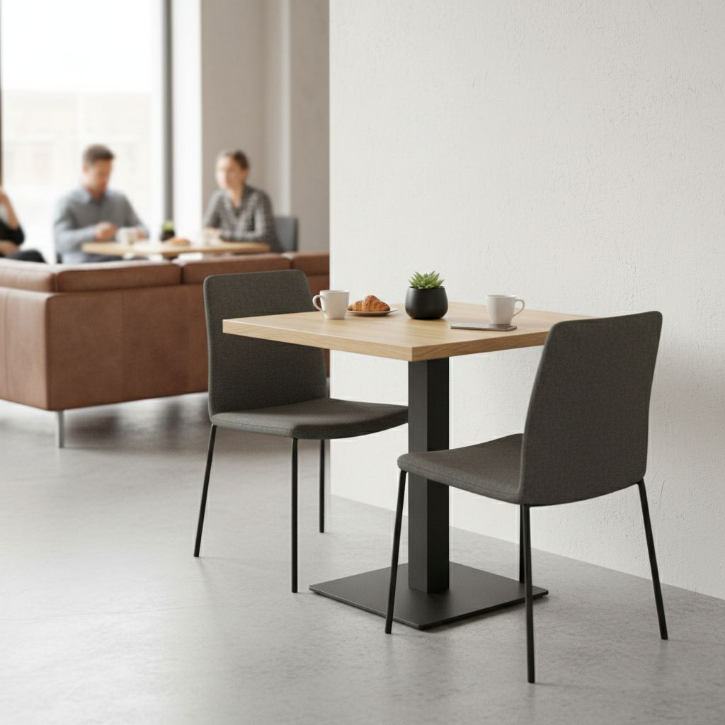 Čtvercovou desku o straně 60 cm nese středová podnož z práškované ocele, jejíž černá barva elegantně doplňuje přírodní texturu dřeva.