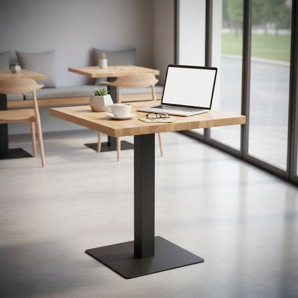 Čtvercovou desku o straně 70 cm nese středová podnož z práškované ocele, jejíž černá barva elegantně doplňuje přírodní texturu dřeva.