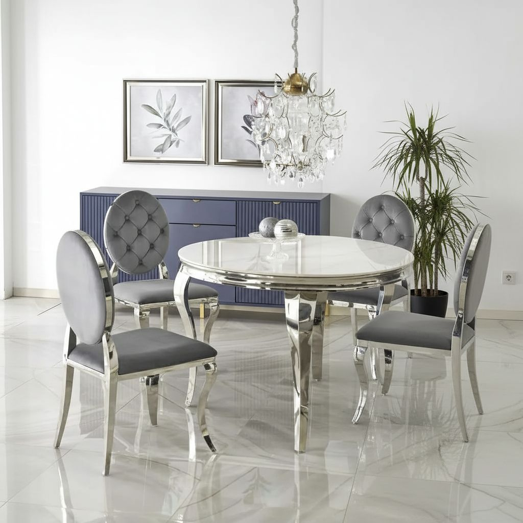 Kontrastující nohy z nerezové oceli s rafinovanými křivkami nejen podtrhují moderní estetiku stolu, ale také zajišťují jeho stabilitu a pevnost. Dohromady celek připomíná nábytek šlechtického sídla.