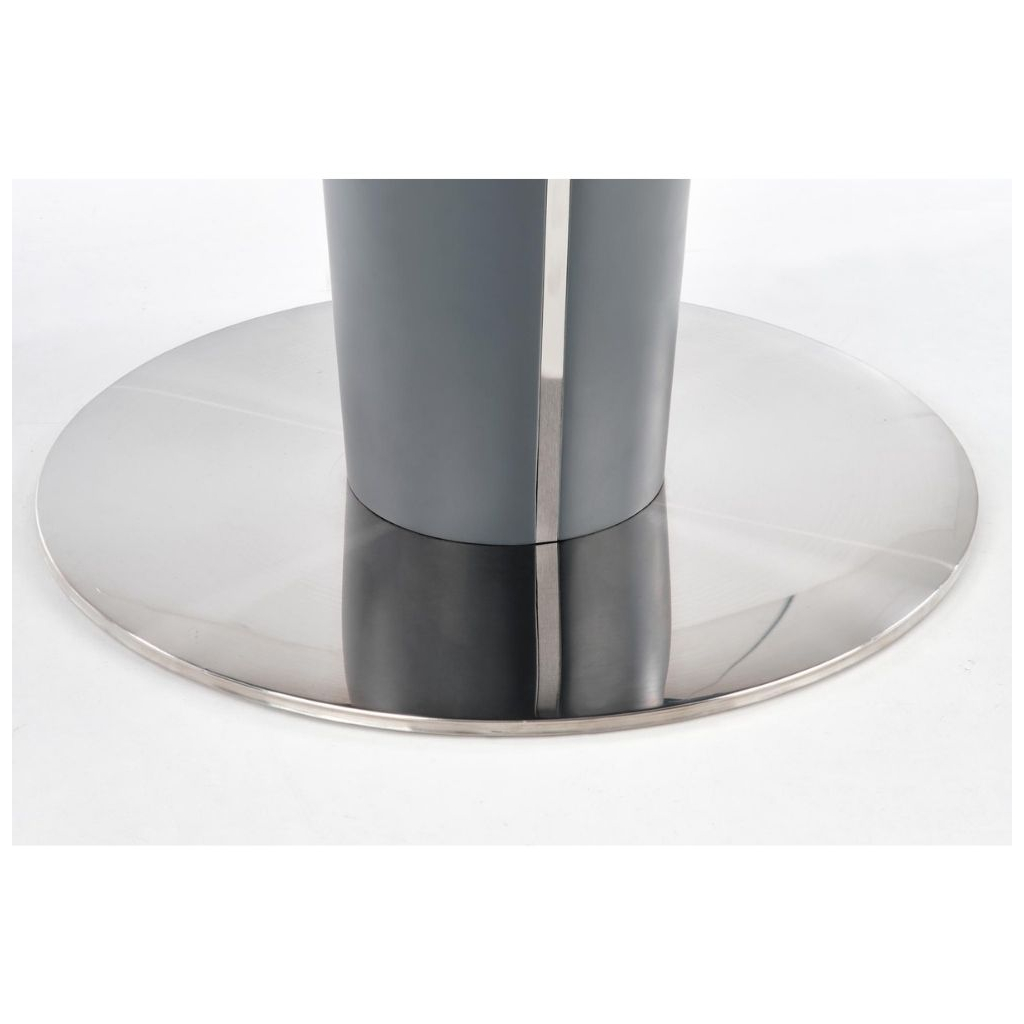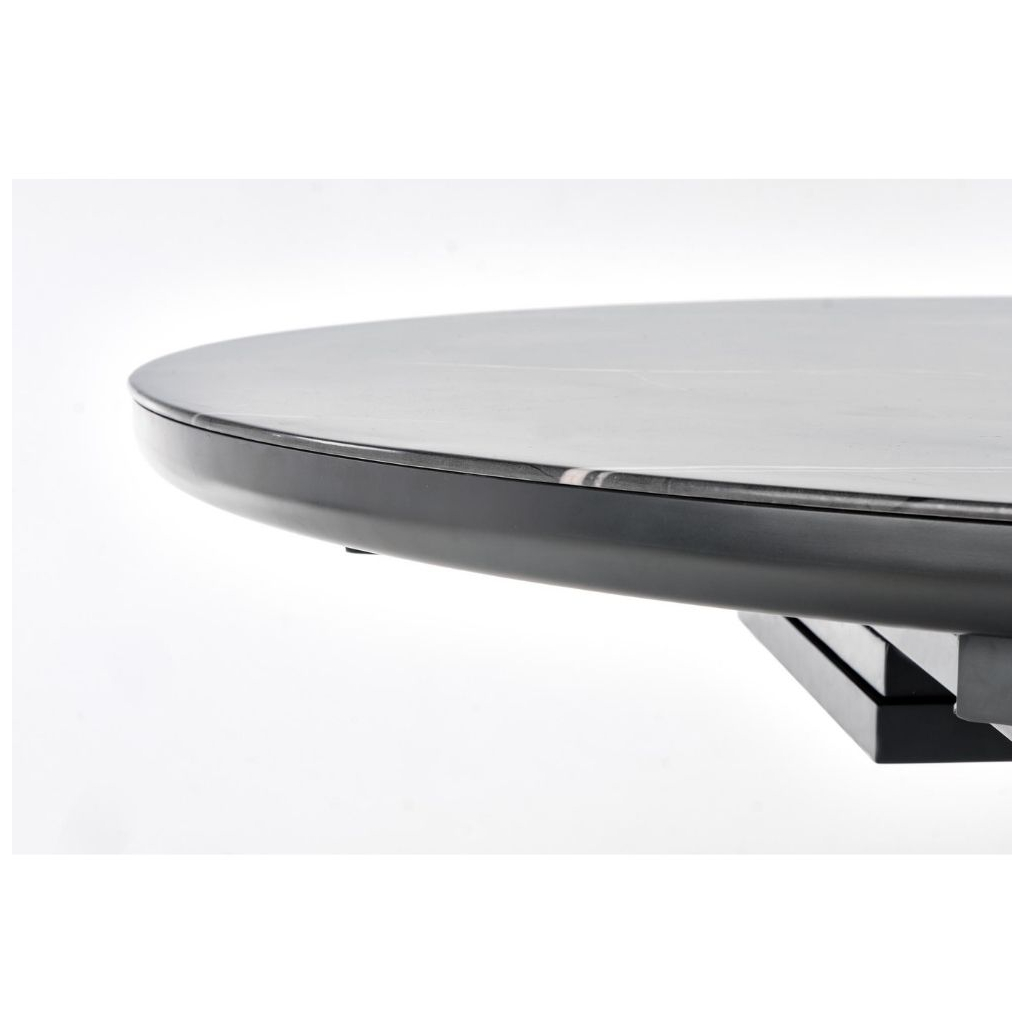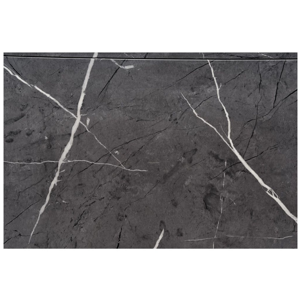 Robustní deska stolu je vyrobena z lakované MDF v kombinaci se sklem v barevném provedení černý mramor. Noha stolu jsou kontruována tak, aby ze stolu vytvořila designovou záležitost a současně zajistila stolu maximální stabilitu. Tu umocňuje její provedení z nerez oceli.