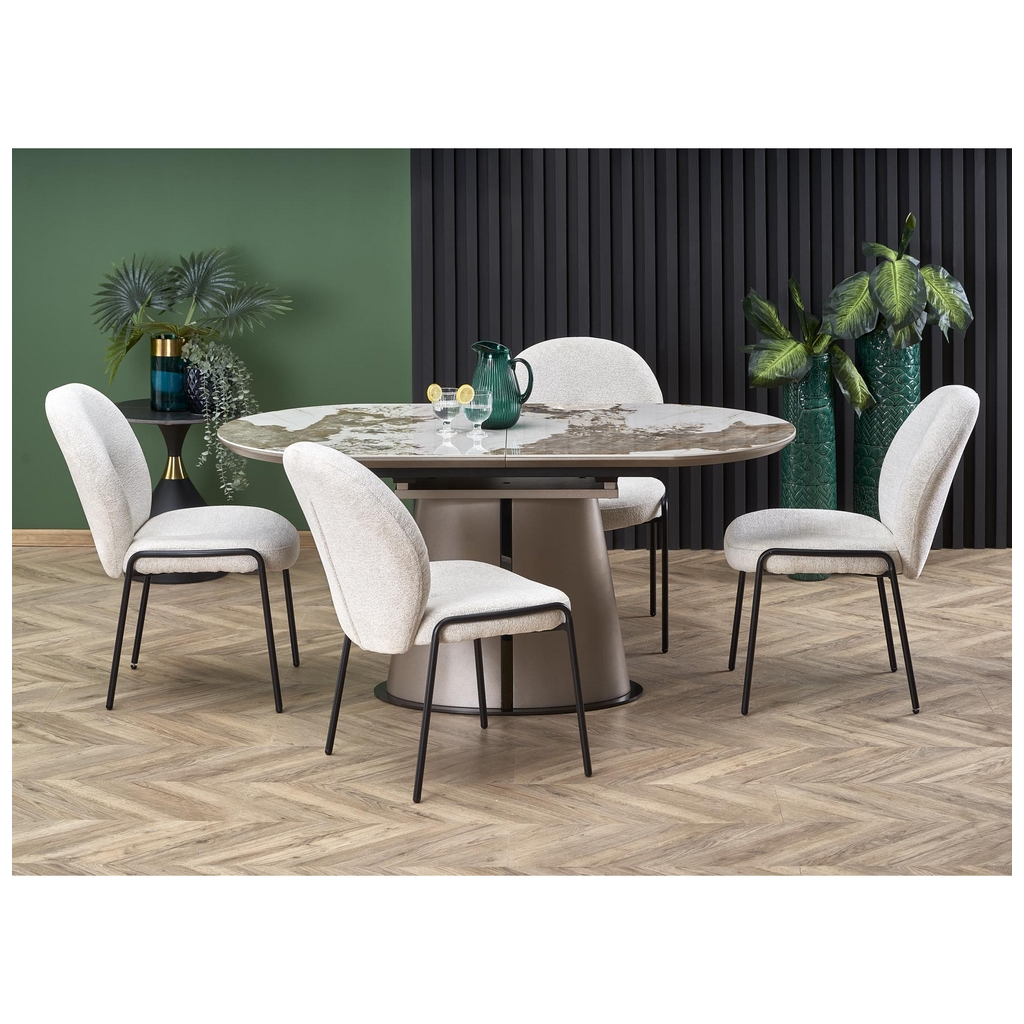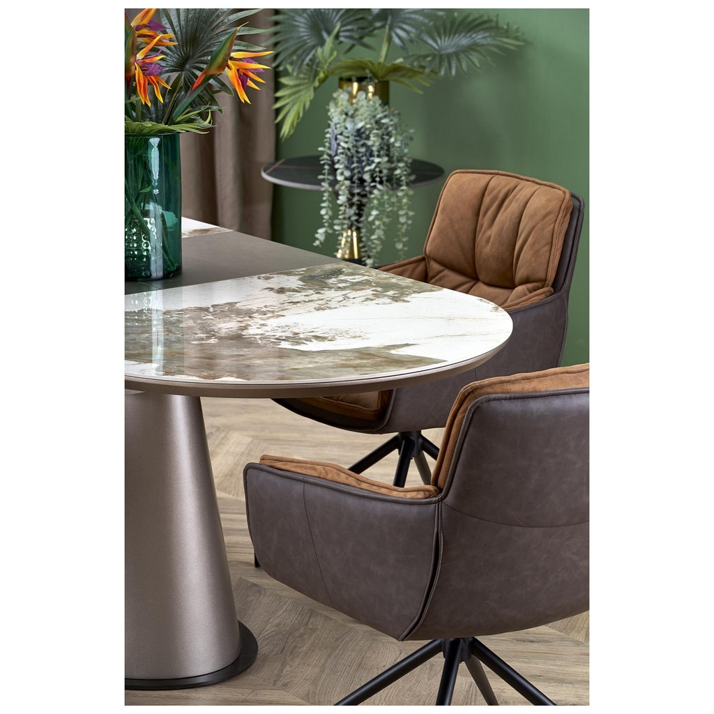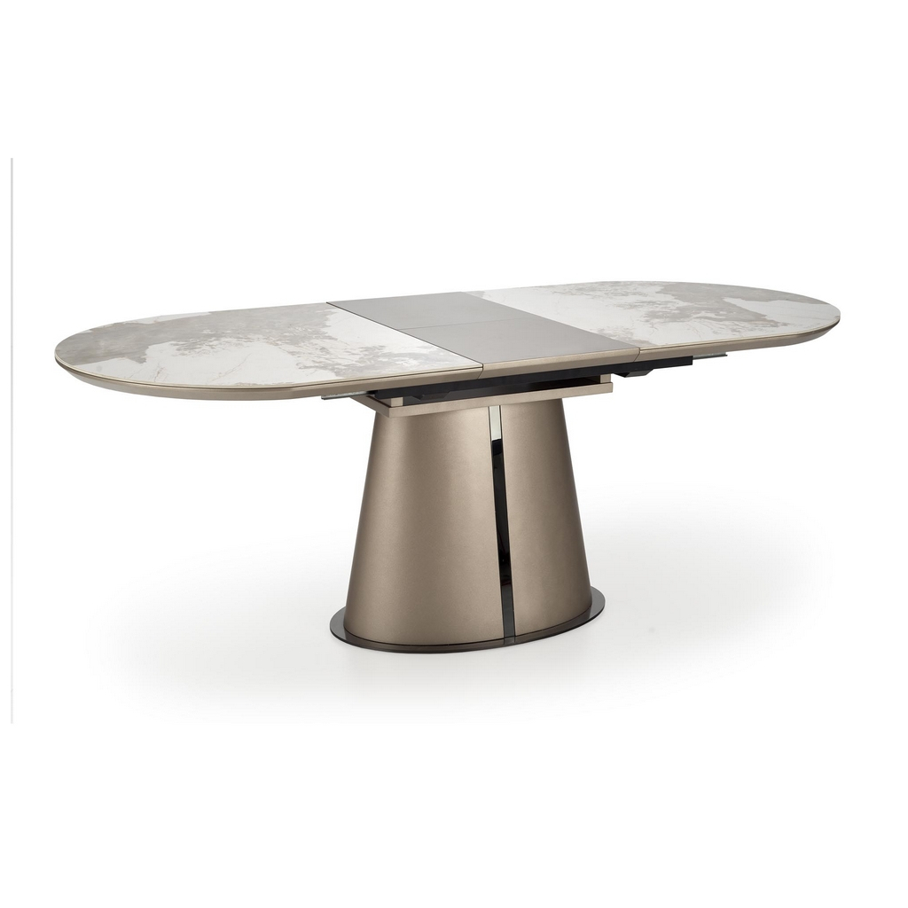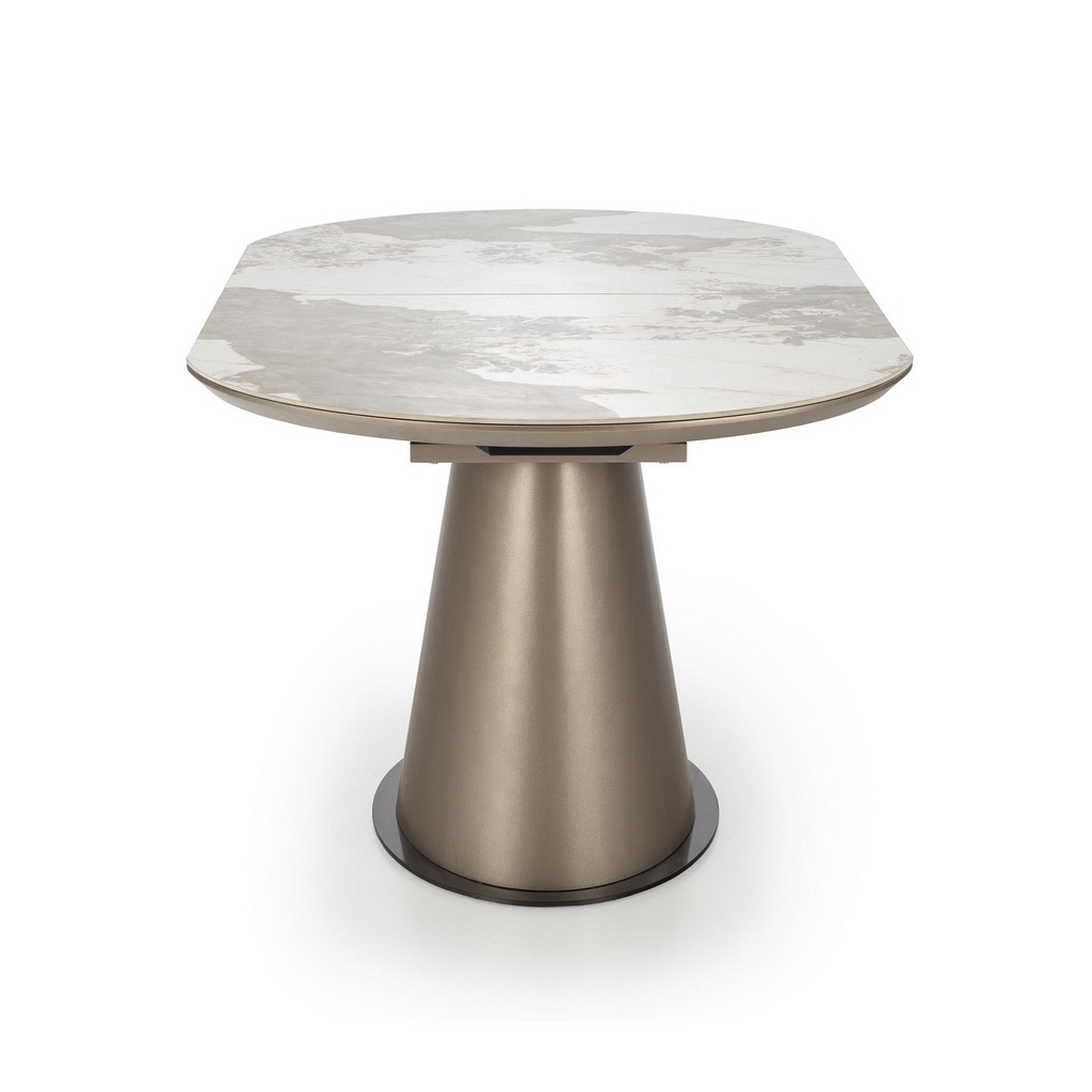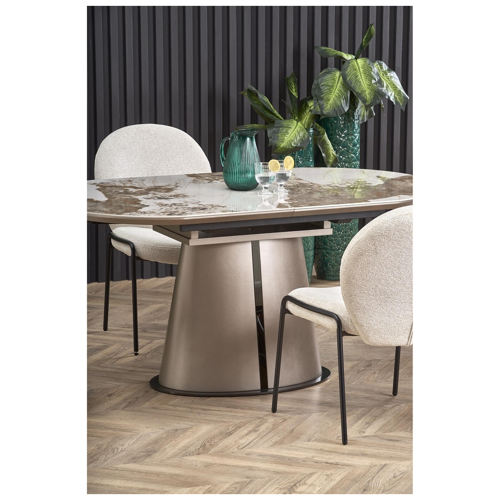 Hlavním poznávacím znamením je keramická deska stolu s unikátní mramorovanou texturou. Ta se vkusně doplňuje se zbytkem konstrukce, který je z lakovaných MDF desek a práškované ocele.