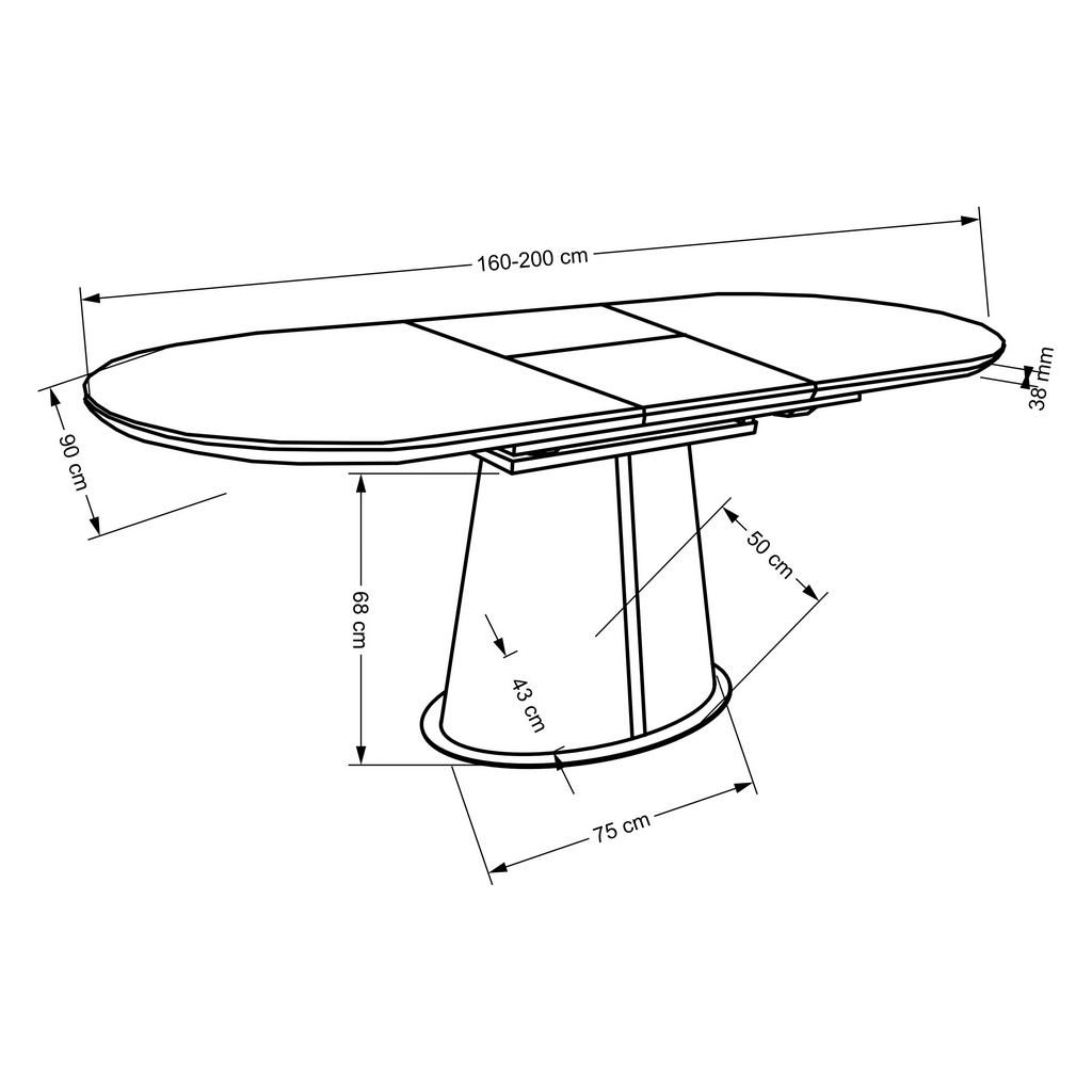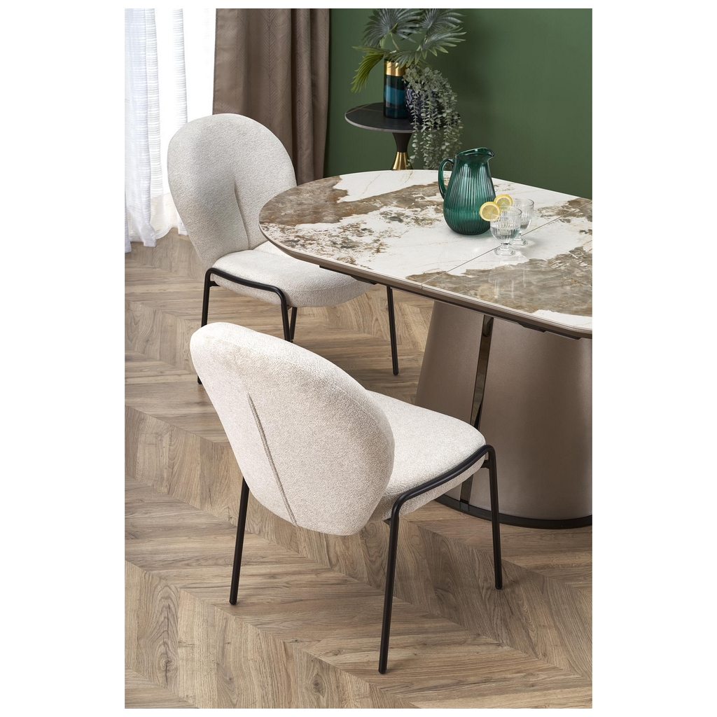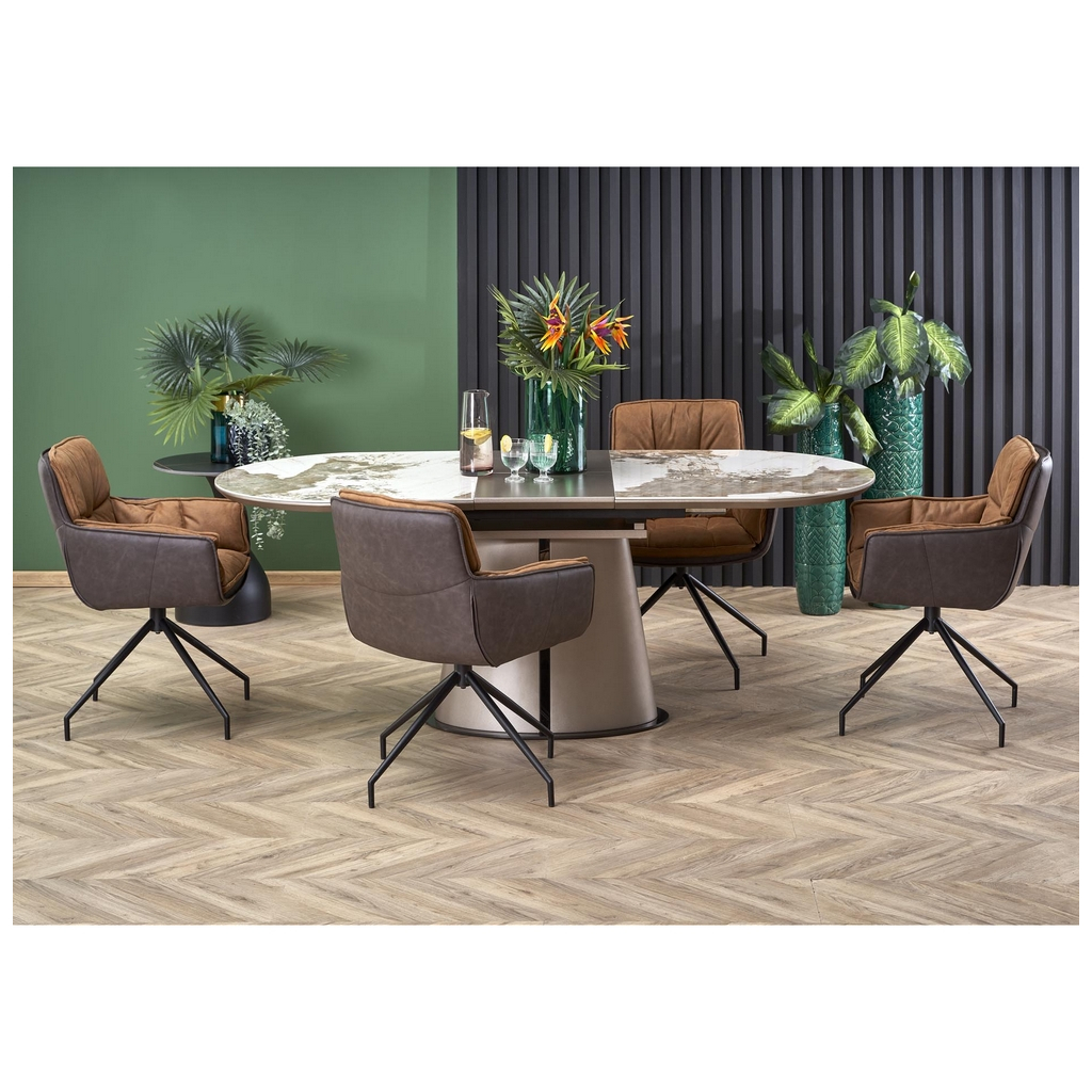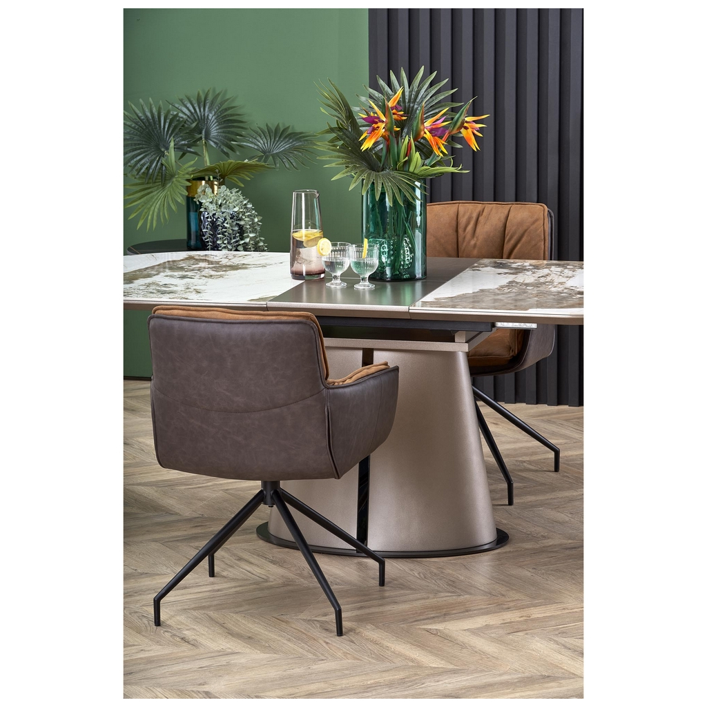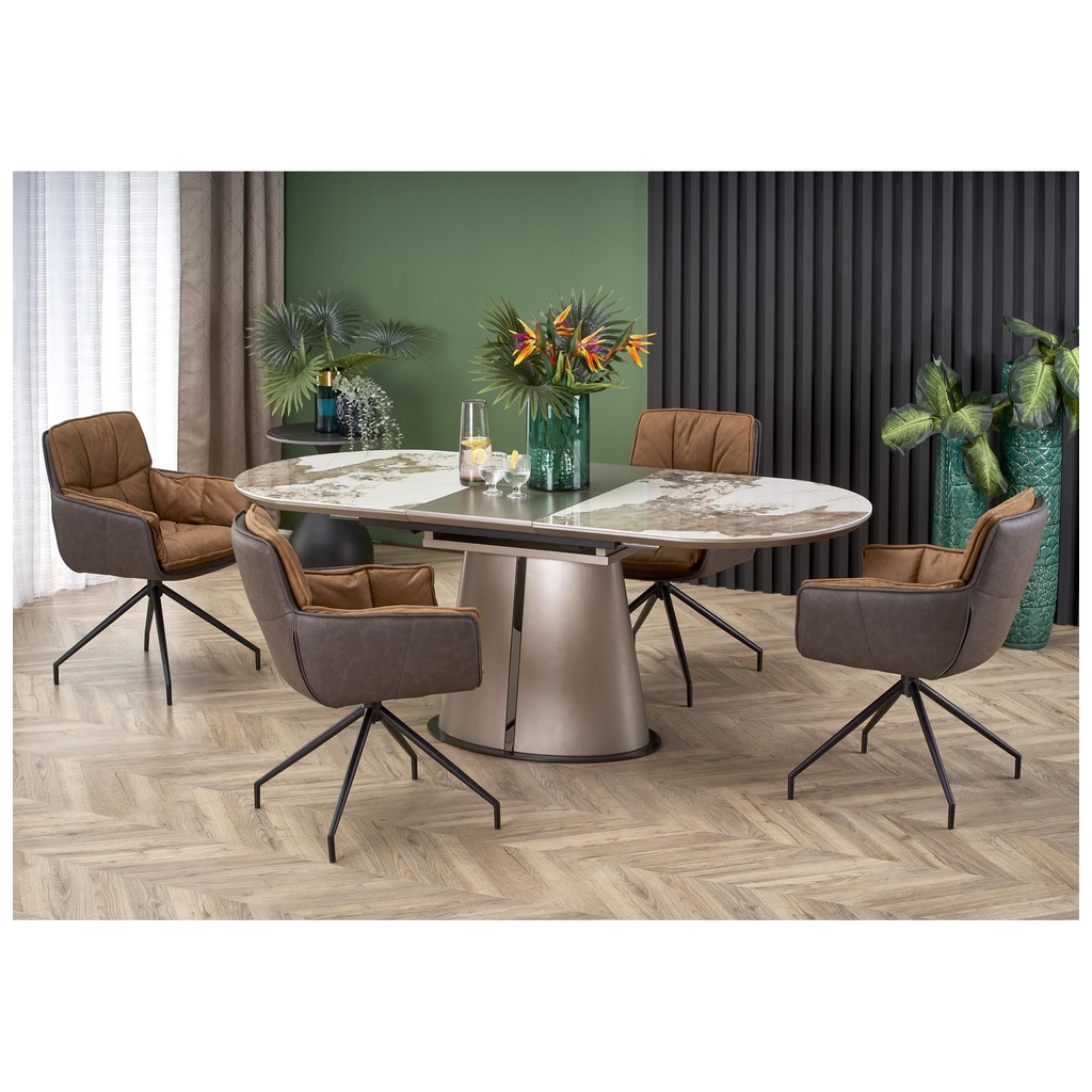 Hlavním poznávacím znamením je keramická deska stolu s unikátní mramorovanou texturou. Ta se vkusně doplňuje se zbytkem konstrukce, který je z lakovaných MDF desek a práškované ocele.