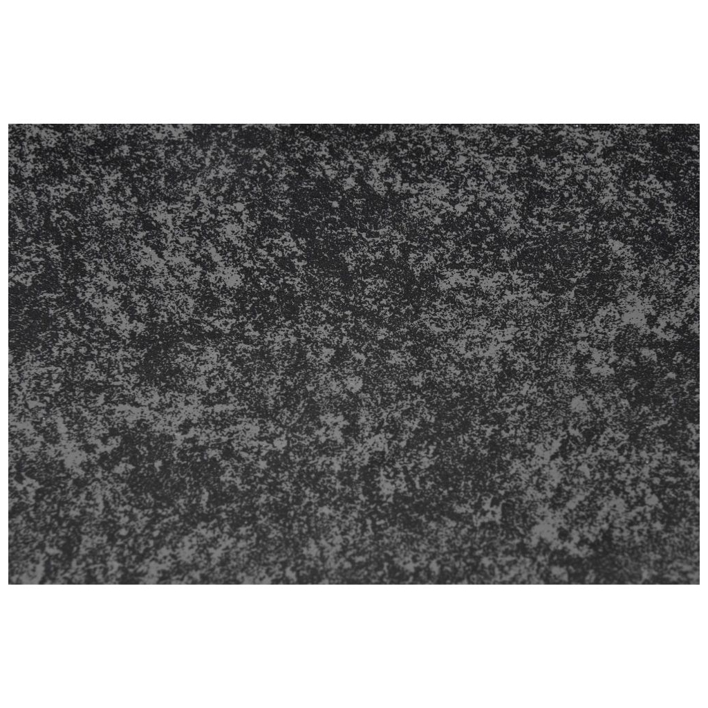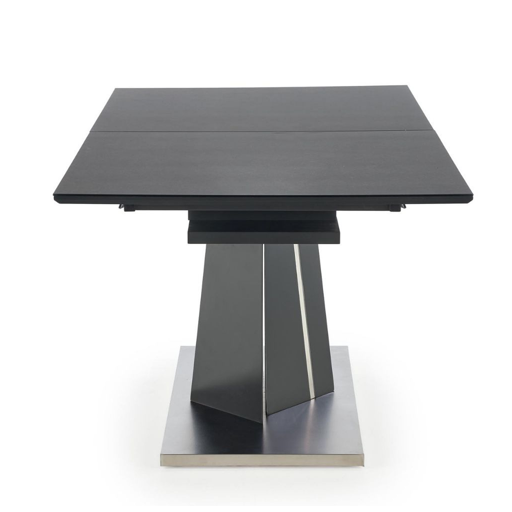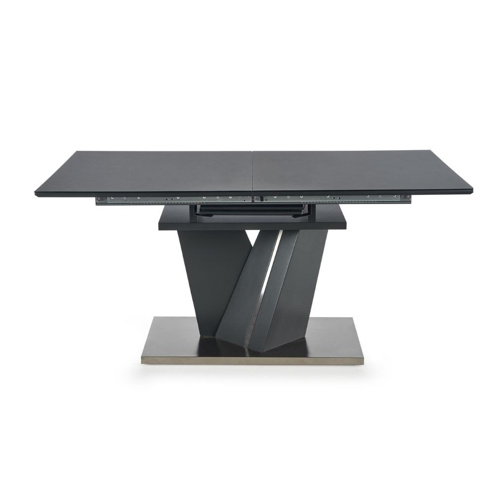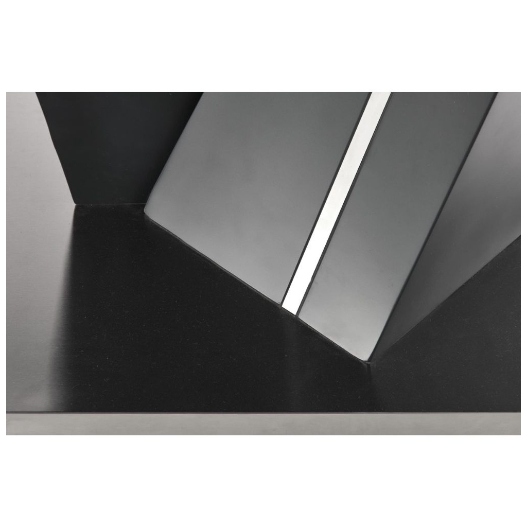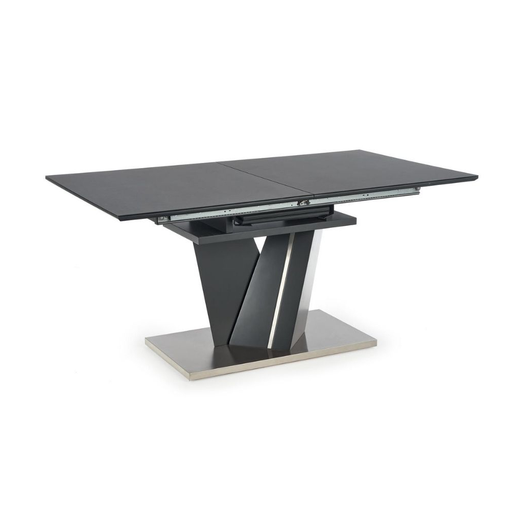Deska stolu je vyrobena z lakované MDF v kombinaci se sklem v barevném provedení tmavě šedá. Noha stolu je konstruována tak, aby zajistila stolu maximální stabilitu. Tu umocňuje její provedení z nerez oceli v tmavé barvě.