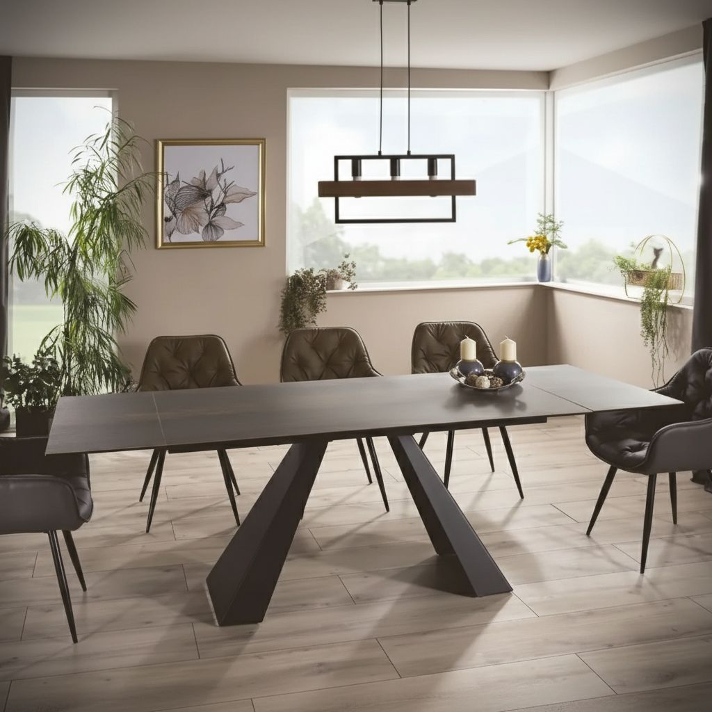 Statná kovová podnož podpírá desku z tvrzeného skla a španělské keramiky se sofistikovaným dekorem dřeva. Stůl vydrží i méně citlivé zacházení a zároveň jeho údržbou nestrávíte mládí – vystačíte si s vlhkým hadříkem, případně slabým saponátem.