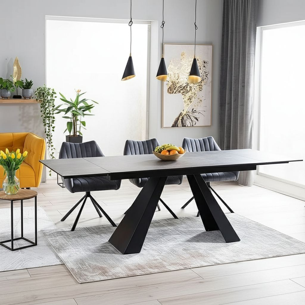 Statná kovová podnož podpírá desku z tvrzeného skla a španělské keramiky s moderním dekorem šedého mramoru. Stůl vydrží i méně citlivé zacházení a zároveň jeho údržbou nestrávíte mládí – vystačíte si s vlhkým hadříkem, případně slabým saponátem.