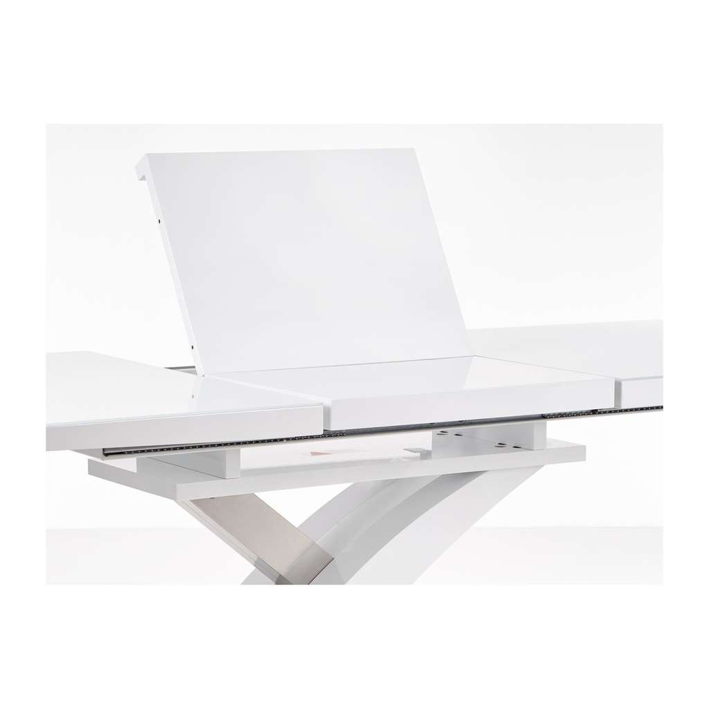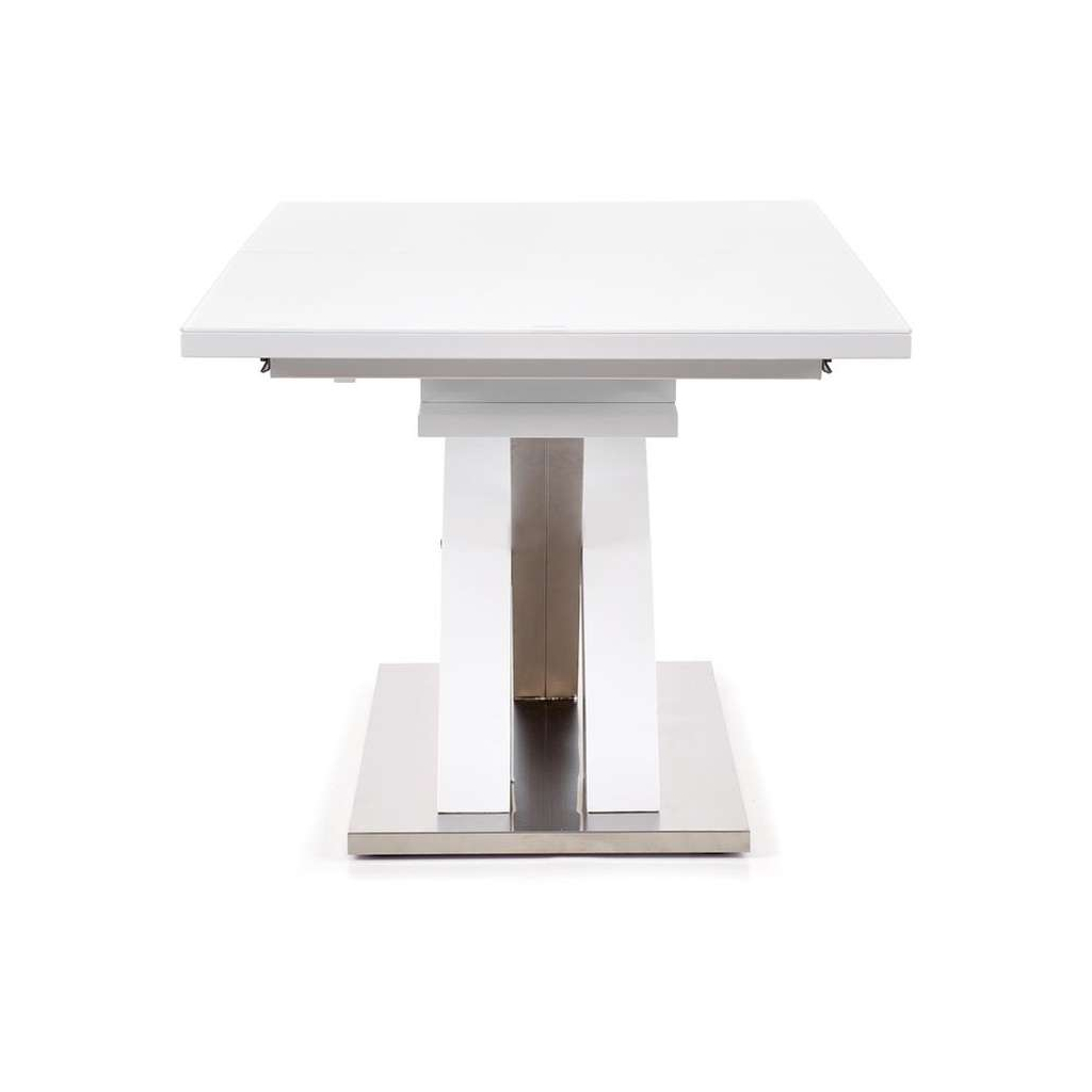 Deska stolu je z tvrzeného skla, přídavná deska pak z MDF. Dřevovláknitá je také podnož, a to v kombinaci s elegantním kovem.