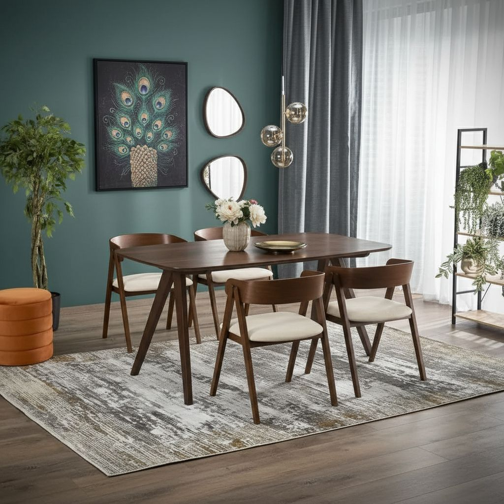 Jeho obdélníková vrchní deska je vyrobená z MDF s přírodní dýhou v dekoru ořechu. Jednoduchá, ale pevná podnož z masivního kaučukového dřeva se postará o celkovou stabilitu stolu.