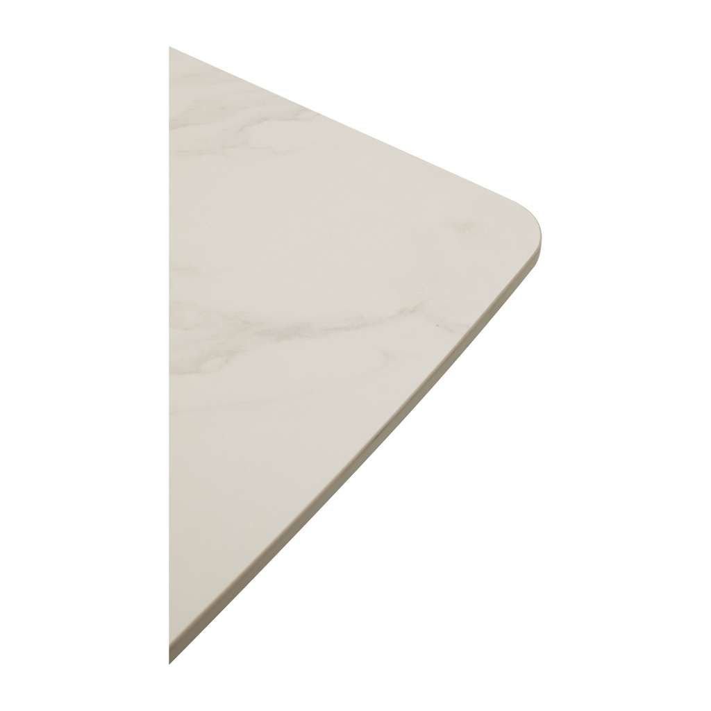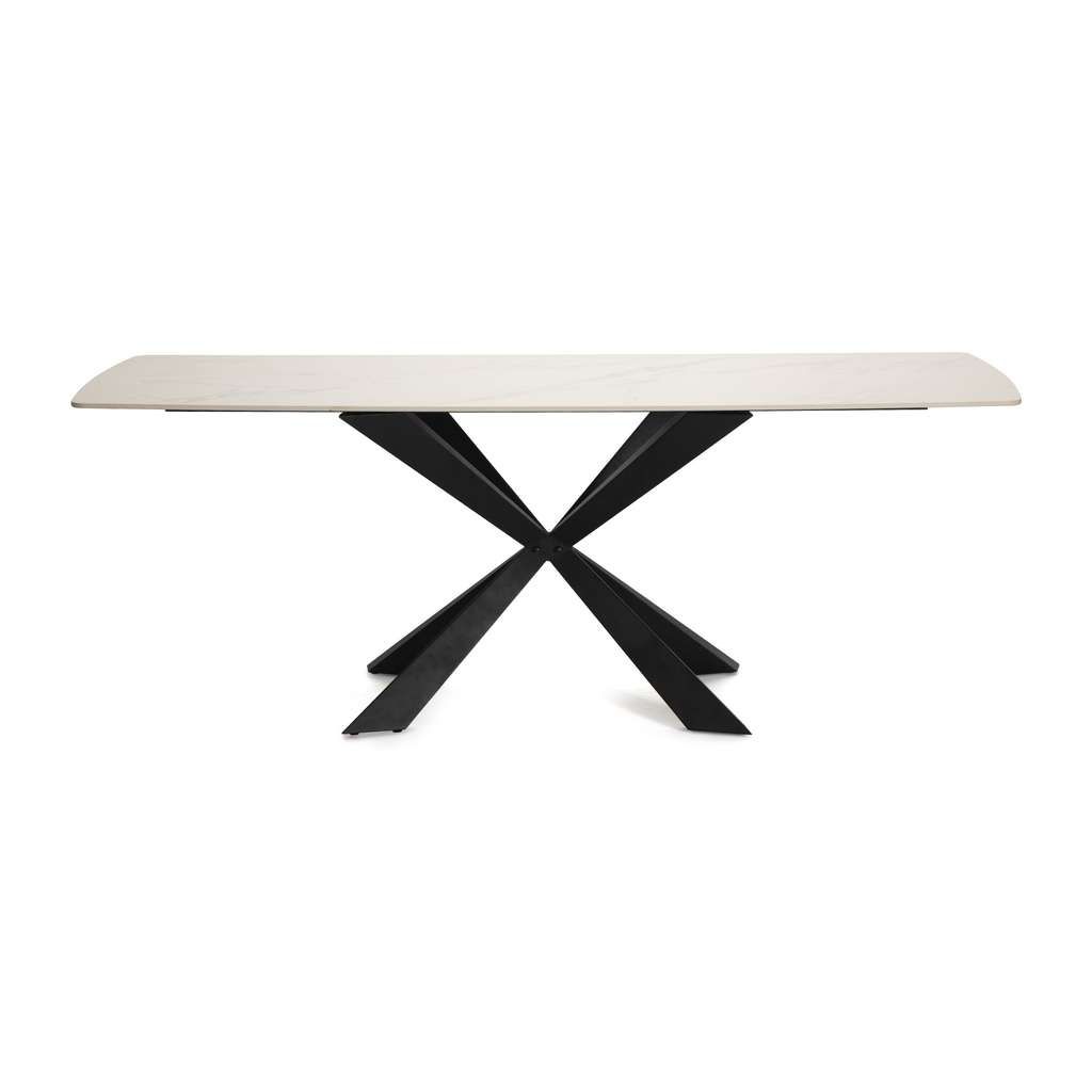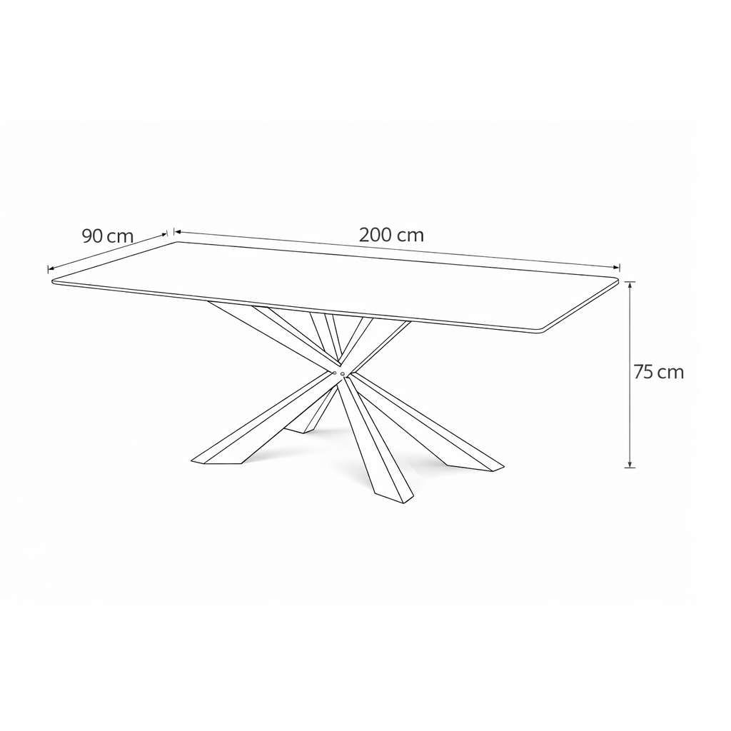 Kovová podnož je navržena s důrazem na stabilitu i styl. Originální křížení nohou dodává stolu zajímavý a moderní vzhled, který se hodí do různých interiérů – od prostorných jídelních zón po stylové apartmány. Díky svému jednoduchému obdélníkovému tvaru je stůl praktický a snadno se kombinuje s ostatním nábytkem.