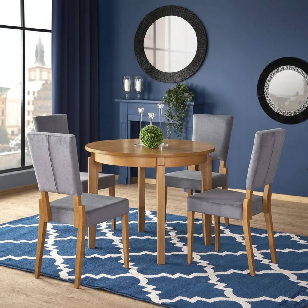 Vrchní deska stolu je vyrobená z MDF s přírodní dýhou v odstínu dubu medového. Výhodou kulatého tvaru desky je úspora prostoru v interiéru.