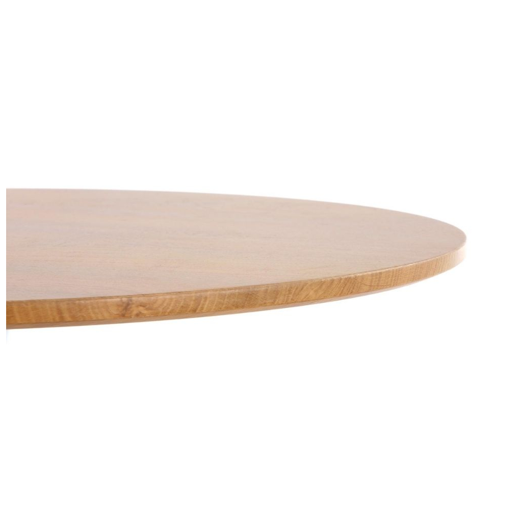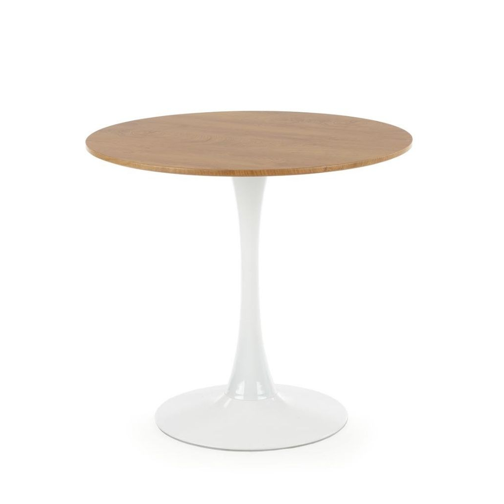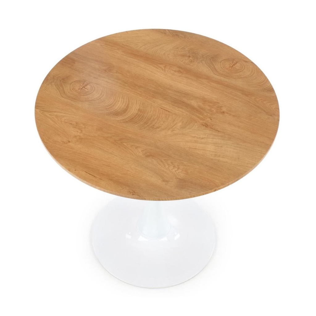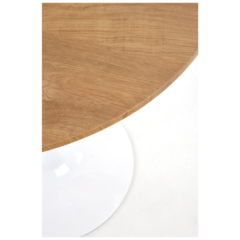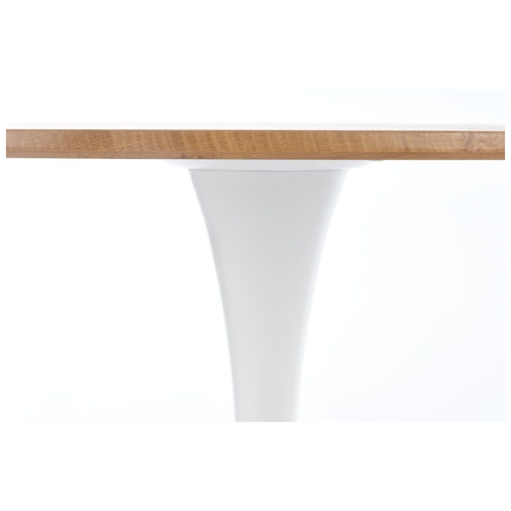 Deska stolu je vyrobena z dýhované MDF v barevném provedení přírodního dřeva. Noha stolu je konstruována tak, aby zajistila stolu maximální stabilitu. Tu umocňuje její provedení z práškované oceli v bílé barvě.
