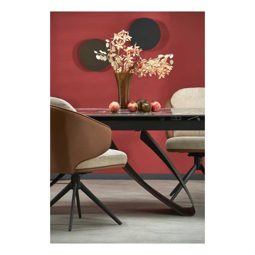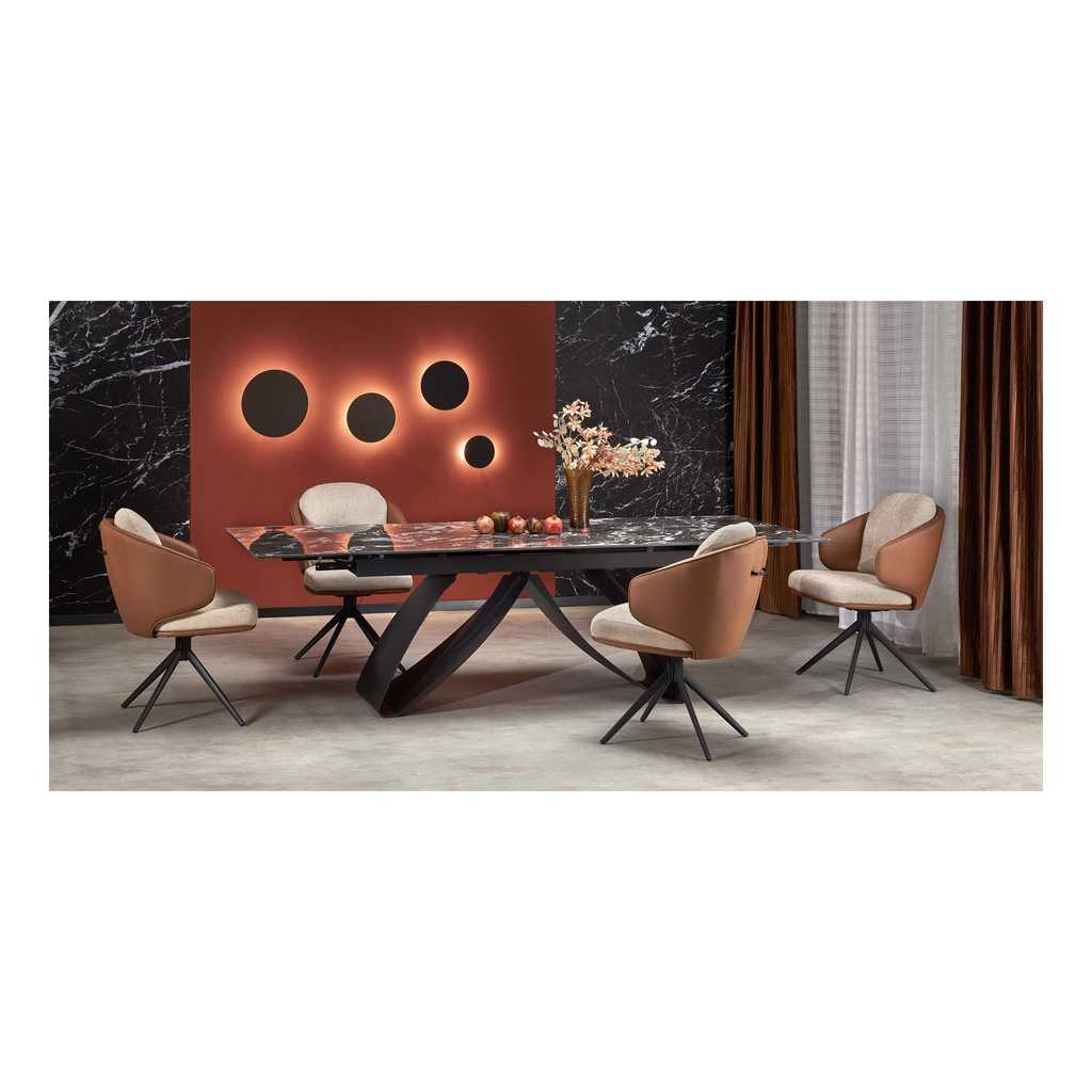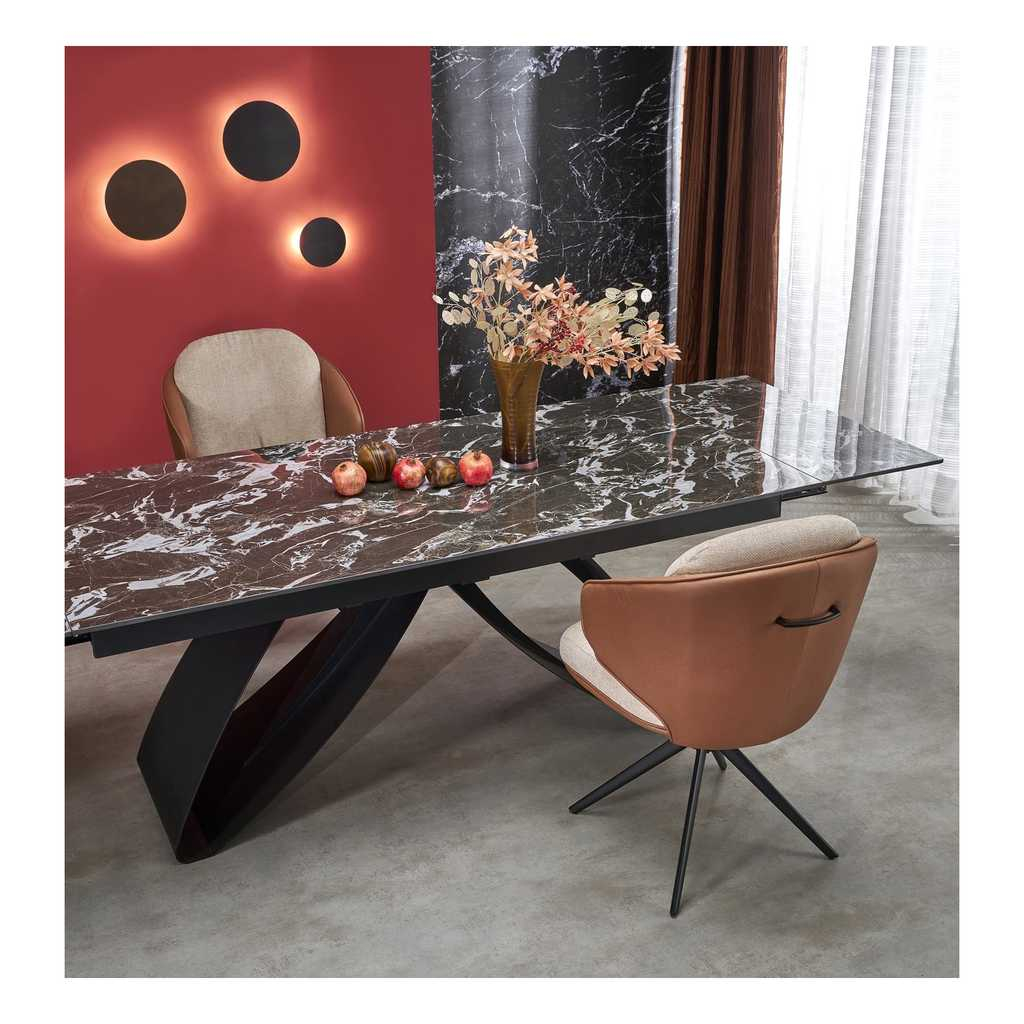 Deska stolu je vyrobená ze sintru s efektem mramoru. Toto spojení tvoří mimořádně odolný, ale i vizuálně úchvatný povrch vhodný jak pro každodenní používání, tak pro speciální příležitosti.