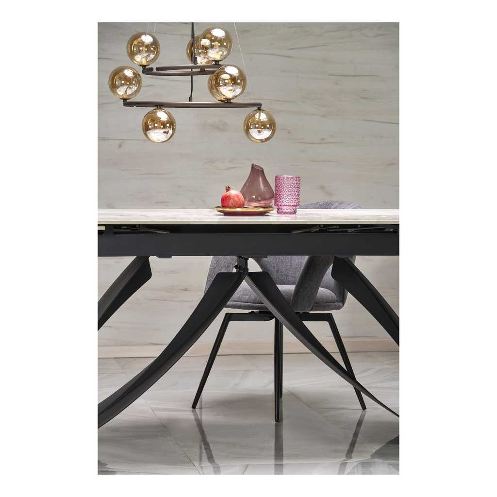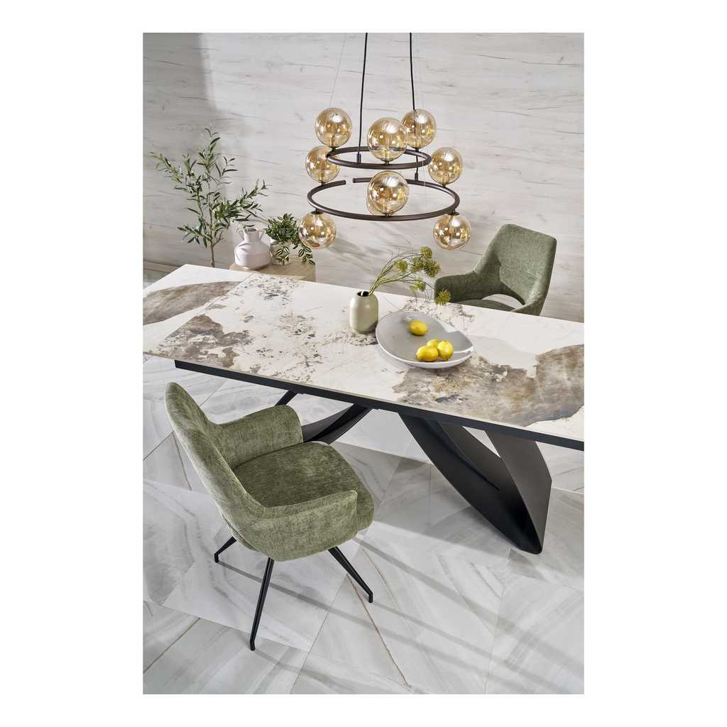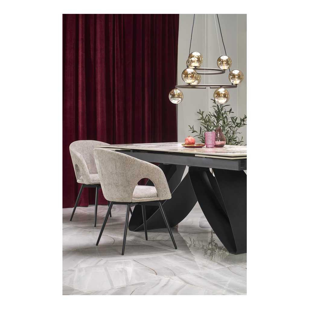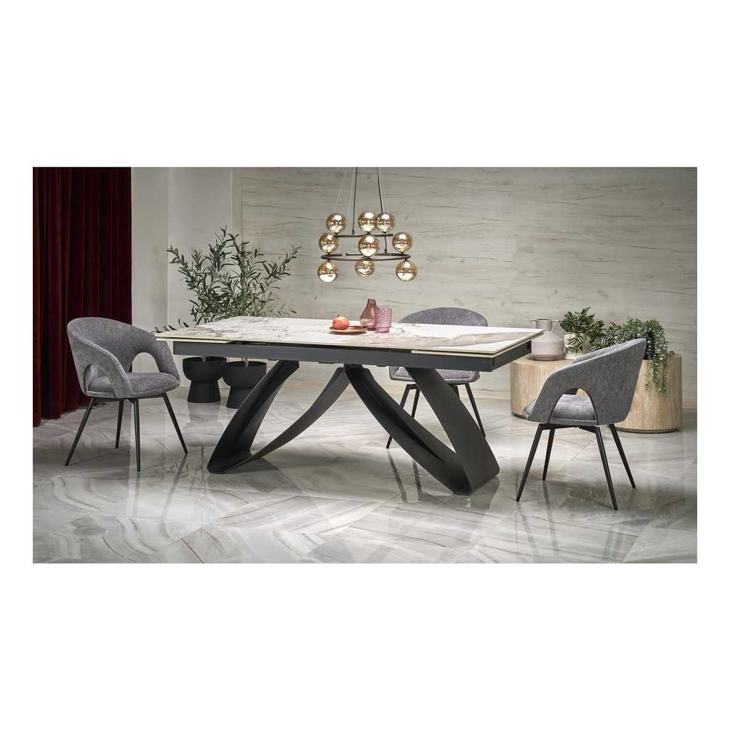Deska stolu je vyrobená ze sintru s efektem mramoru. Toto spojení tvoří mimořádně odolný, ale i vizuálně úchvatný povrch vhodný jak pro každodenní používání, tak pro speciální příležitosti.