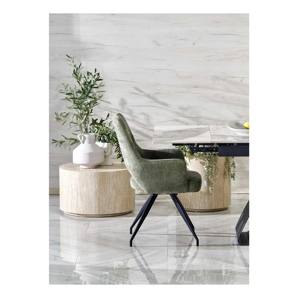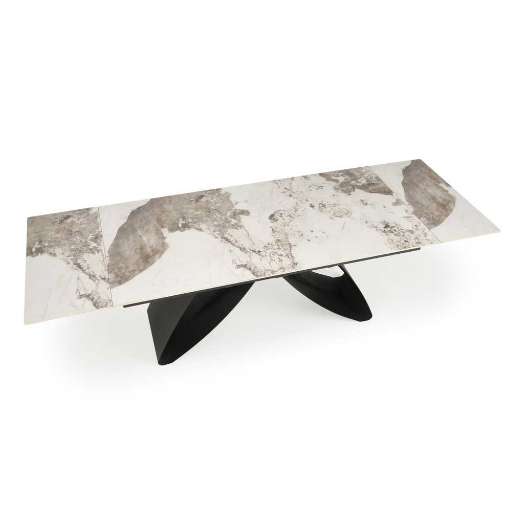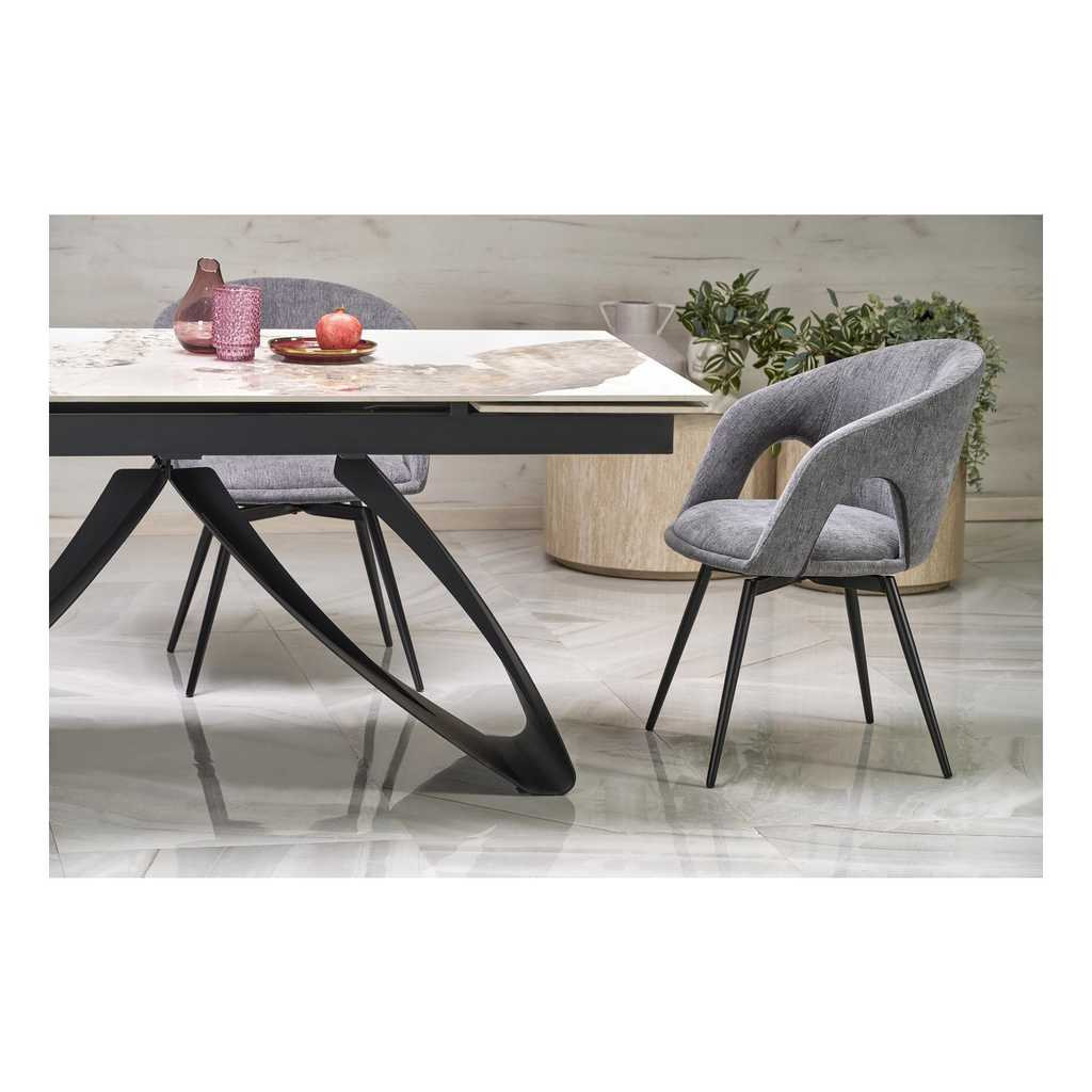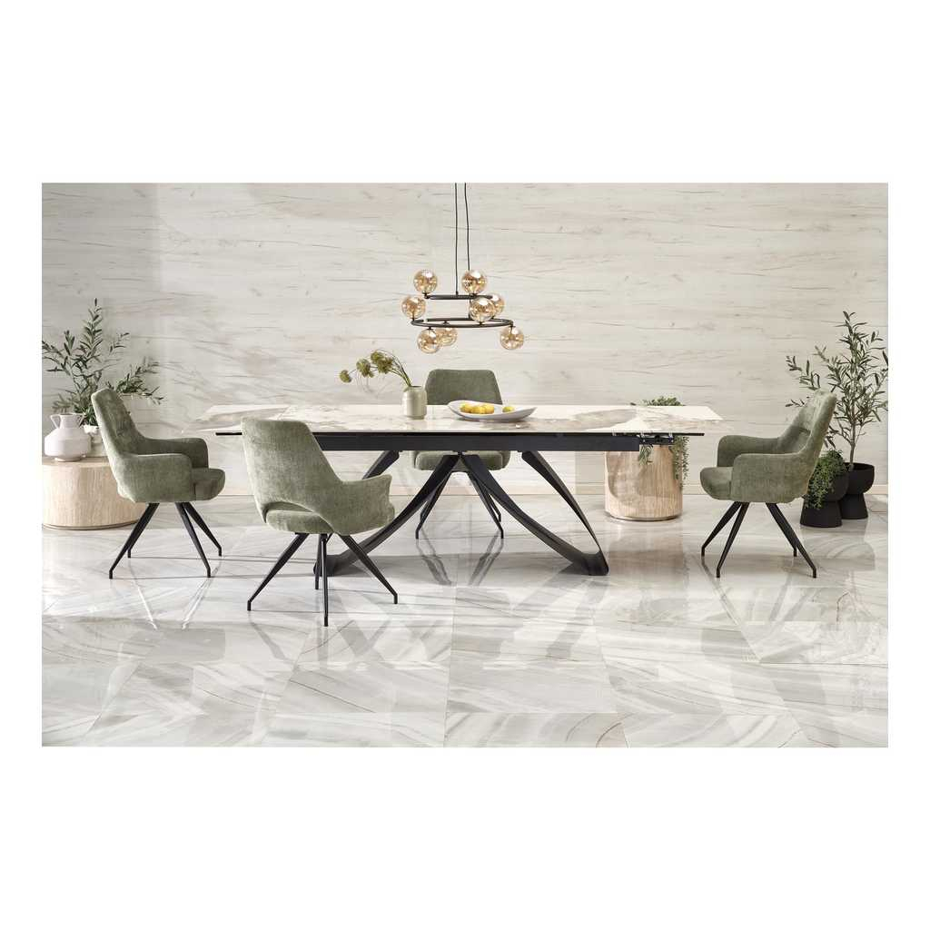 Deska stolu je vyrobená ze sintru s efektem mramoru. Toto spojení tvoří mimořádně odolný, ale i vizuálně úchvatný povrch vhodný jak pro každodenní používání, tak pro speciální příležitosti.