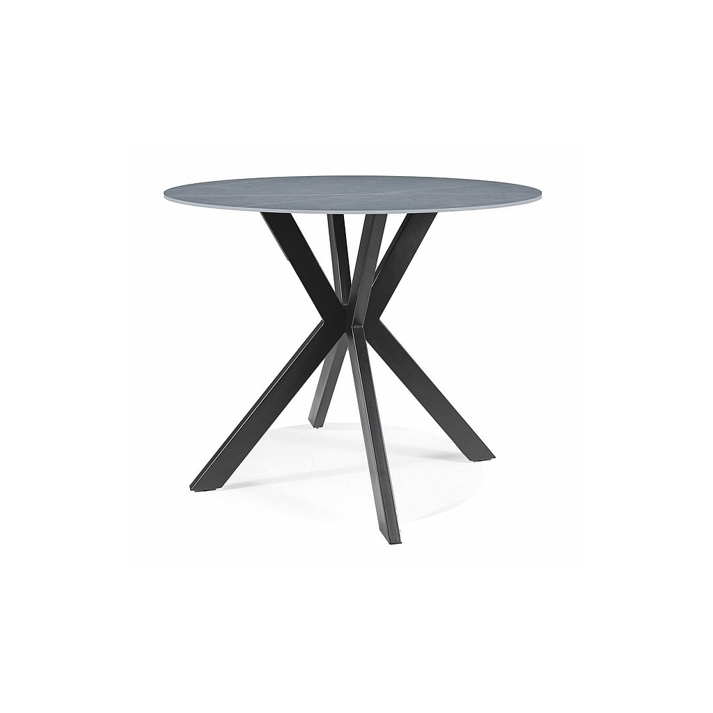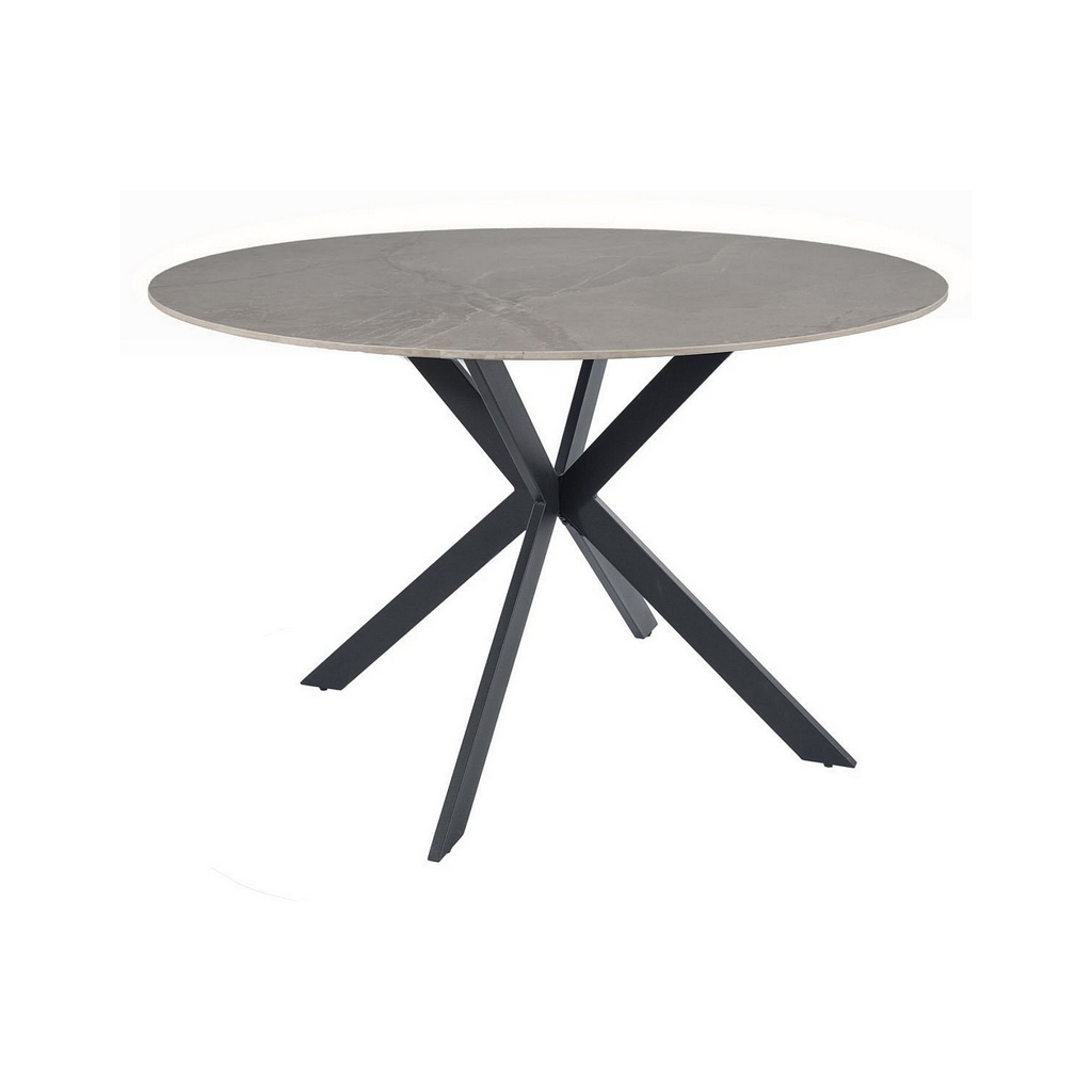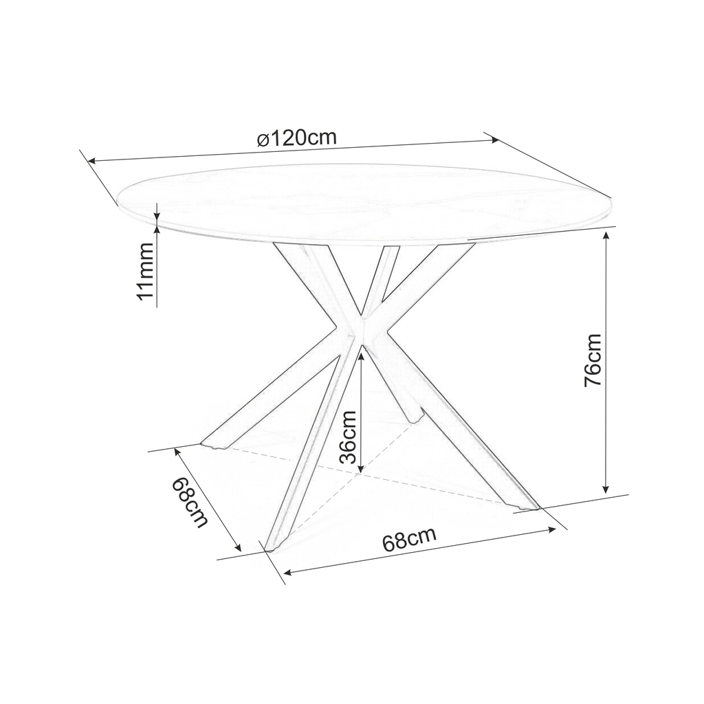Jeho kulatá deska z keramiky o průměru 120 cm vás oslní sofistikovaným efektem mramoru. Desku stolu podpírá nevšedně řešená podnož. Tu tvoří křížící se kovové tyče. Celek je dokonalou kombinací elegance a odolnosti.