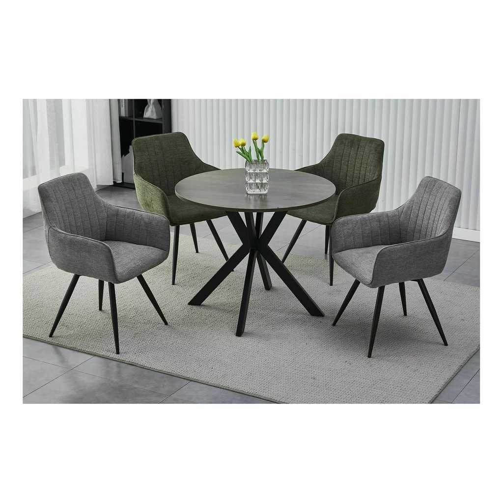 Horní desku tvoří kruh z laminovaného dřevovlákna (MDF) o síle 18 mm a průměru 90 cm. Ve výšce 76 cm ji drží stabilní podnož z práškované ocele, kterou tvoří 4 zahnuté nohy se zúžením ve výšce sedu. To jednak ozvláštňuje vzhled stolu, jednak vám to usnadní zasunutí židlí.