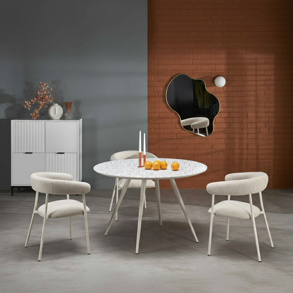 Jídelní stůl Theodore je stylovým a moderním kouskem, který vyniká svou jednoduchou, ale elegantní konstrukcí. Deska stolu je vyrobena z MDF a potažena vysokotlakým laminátem, což jí poskytuje hladký, odolný povrch s jemným terrazzo vzorem, který je nejen vizuálně atraktivní, ale také velmi snadný na údržbu. Laminát zajišťuje odolnost vůči poškrábání a opotřebení, což je ideální pro každodenní používání.