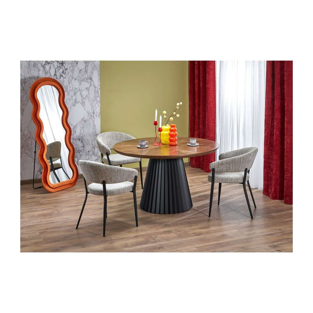 Jídelní stůl Tirgia je ideální volbou pro všechny, kteří hledají kombinaci moderního designu a praktické funkčnosti. Jeho pevná kruhová deska z kvalitního dřeva poskytuje dostatek prostoru pro pohodlné posezení až šesti osob, což je ideální pro rodinné večeře i posezení s přáteli.