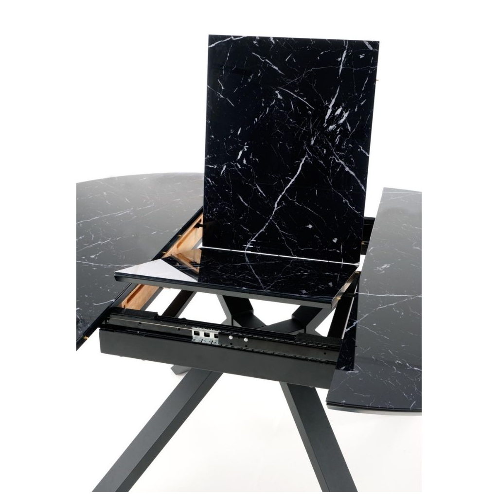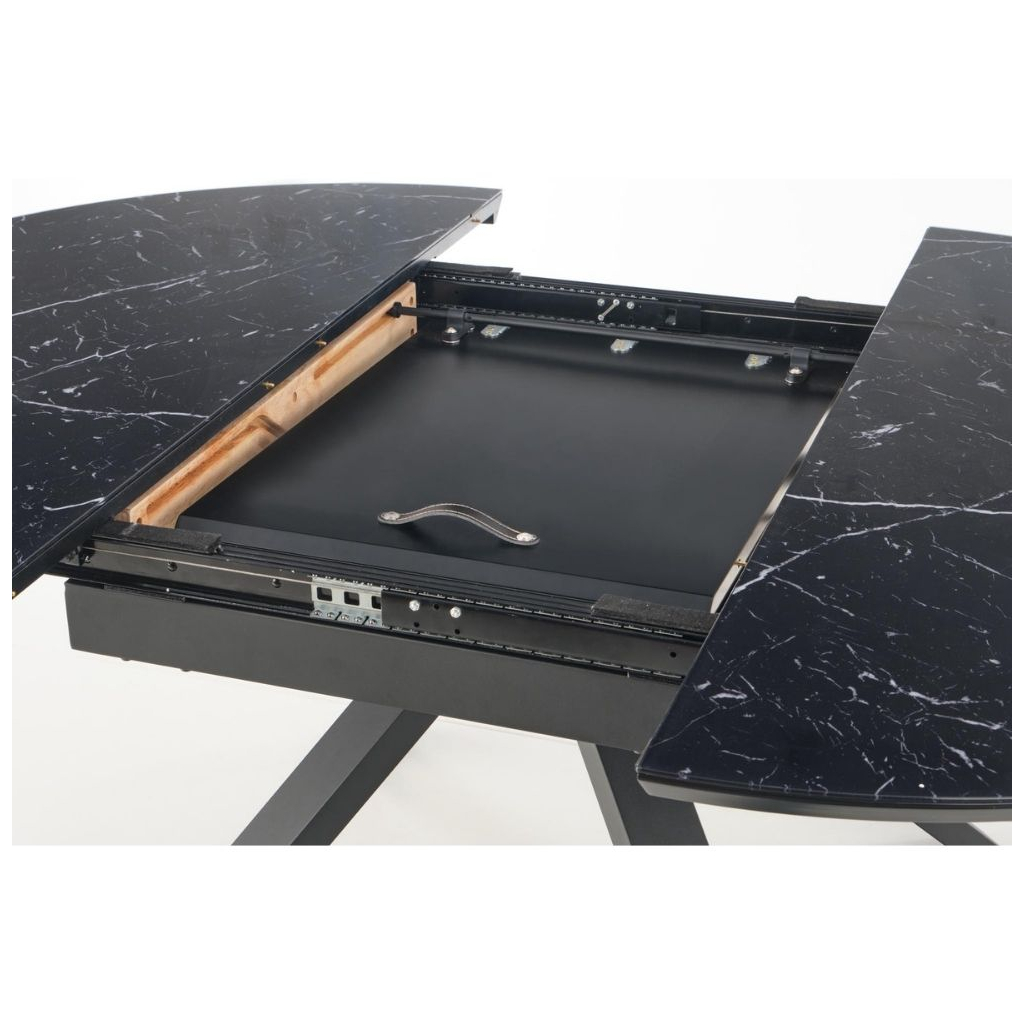 Deska stolu je vyrobena ze skla v kombinaci s lakovanou MDF deskou. Je v barevném provedení černý mramor. Nohy stolu jsou z pevné a stabilitu zajišťující práškované oceli v barevném provedení černá.