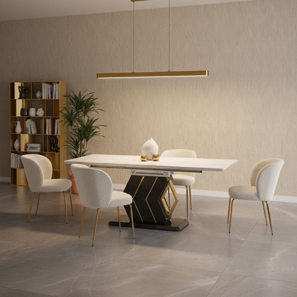 Noha z chromované oceli zajišťuje stabilitu stolu. Ta je umocněná obdélníkovou podstavou a efektem mramoru. Podnože nese desku z dýhovaných a lakovaných MDF desek s dekorem mramoru. Výhodou tohoto materiálu je snadná údržba – vystačíte si s vlhkým hadříkem.