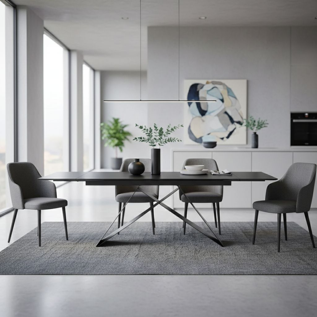 Deska stolu je zhotovena z tvrzeného skla, čímž jídelní stůl působí bytelně a současně elegantně. Nohy zajímavého a netradičního tvaru jsou kovové a zajišťují stolu žádoucí stabilitu. Deska stolu je v provedení černý mat.
