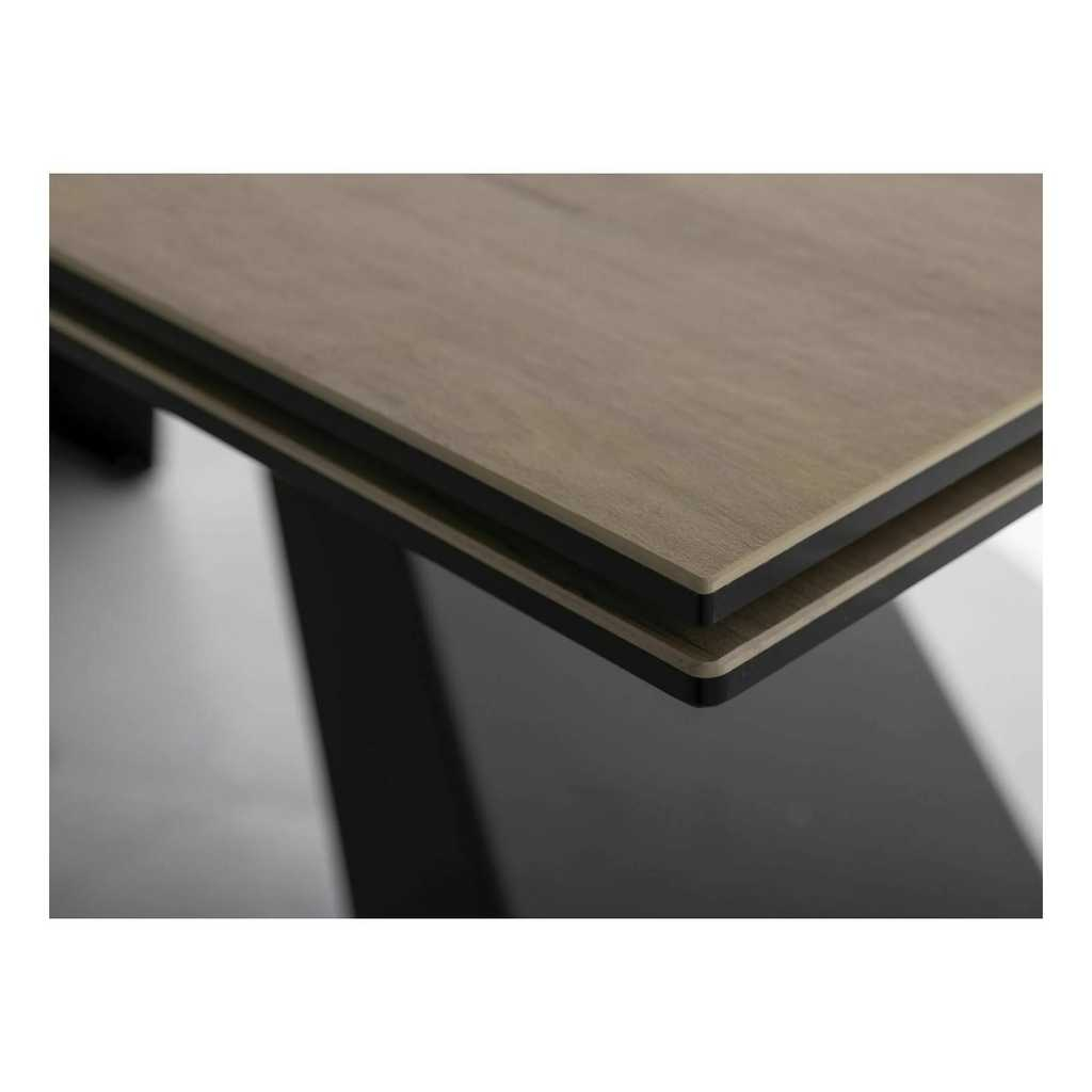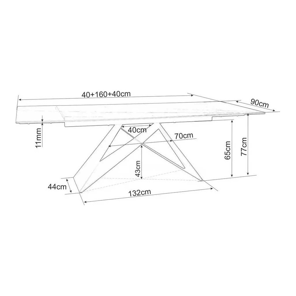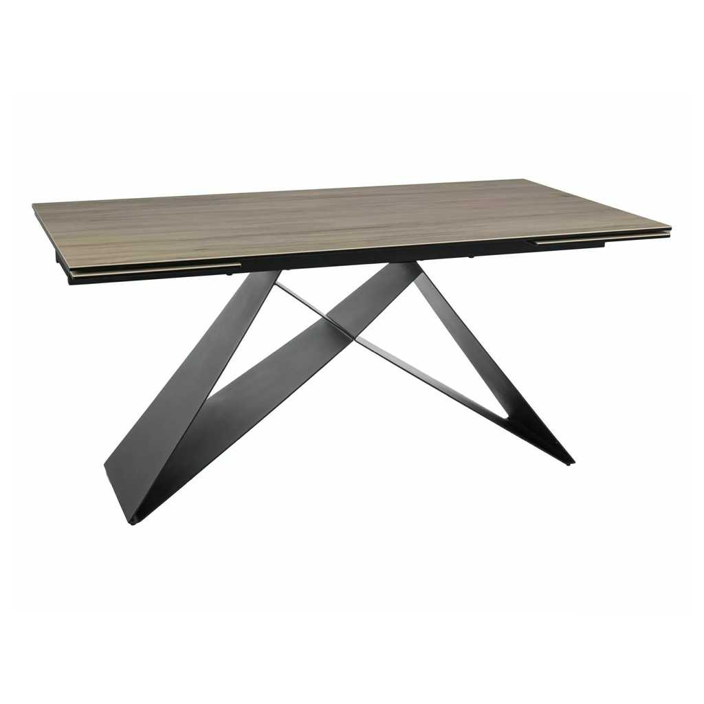 Deska stolu je zhotovena z tvrzeného skla v kombinaci s keramikou, čímž jídelní stůl působí bytelně a současně elegantně – k tomu přispívá i unikátní povrchová úprava, která je u každé barevné varianty trochu jiná. Nohy zajímavého a netradičního tvaru jsou kovové a zajišťují stolu skvělou stabilitu.
