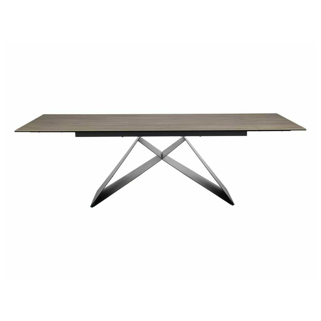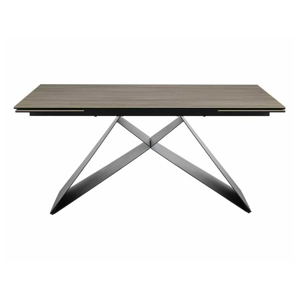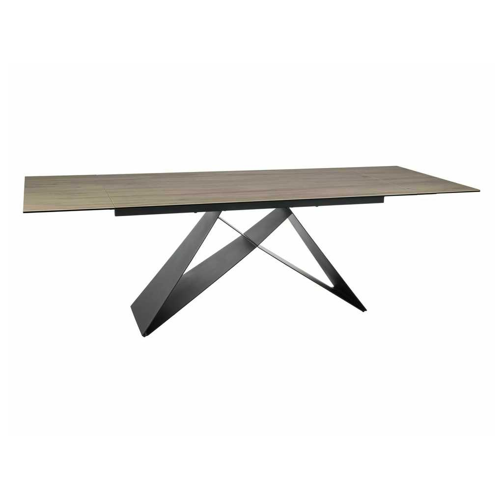 Deska stolu je zhotovena z tvrzeného skla v kombinaci s keramikou, čímž jídelní stůl působí bytelně a současně elegantně – k tomu přispívá i unikátní povrchová úprava, která je u každé barevné varianty trochu jiná. Nohy zajímavého a netradičního tvaru jsou kovové a zajišťují stolu skvělou stabilitu.