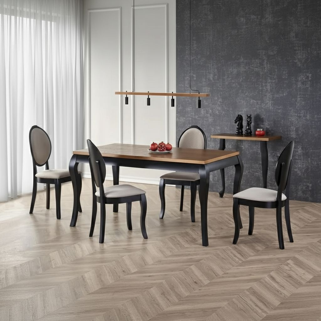 Horní deska je vyrobené z dýhovaných desek. Výhodou stolu je snadná údržba – čistotu udržíte pomocí navlhčeným hadříkem. Nohy, tvarované v zámeckém stylu, tvoří masivní bukové dřevo.