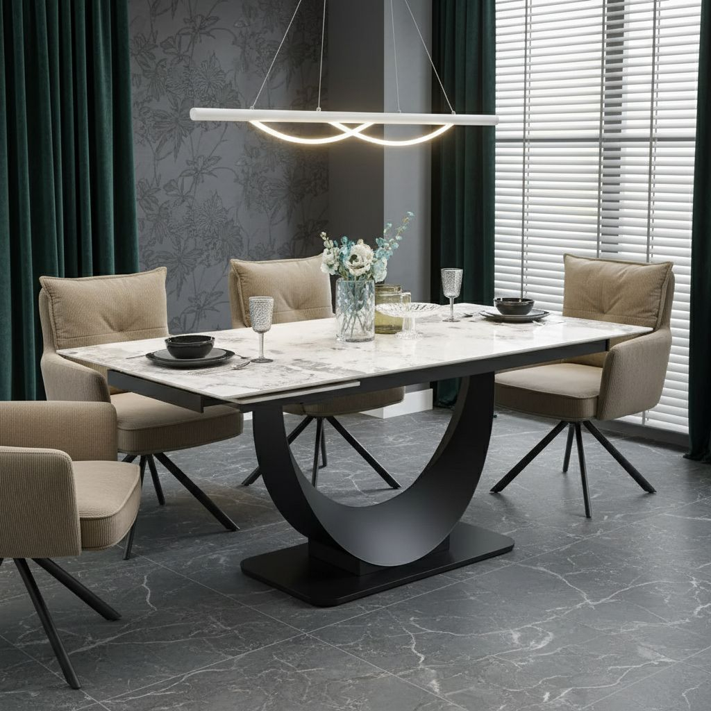 Deska stolu je vyrobená ze sintru s efektem mramoru. Toto spojení tvoří mimořádně odolný, ale i vizuálně úchvatný povrch vhodný jak pro každodenní používání, tak pro speciální příležitosti.