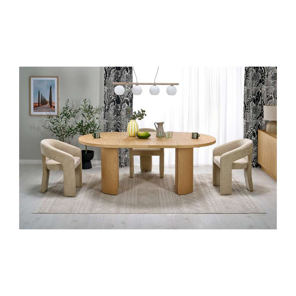 Tvar desky kombinuje elegantní křivky kruhu a oválu, což přináší zajímavý vizuální efekt a zároveň optimalizuje prostor pro sezení. Masivní dřevěná podnož dodává stabilitu a působí opravdu solidně. Díky pevnému materiálu a kvalitnímu zpracování získáte stůl, který bude ozdobou vašeho domova po mnoho let.