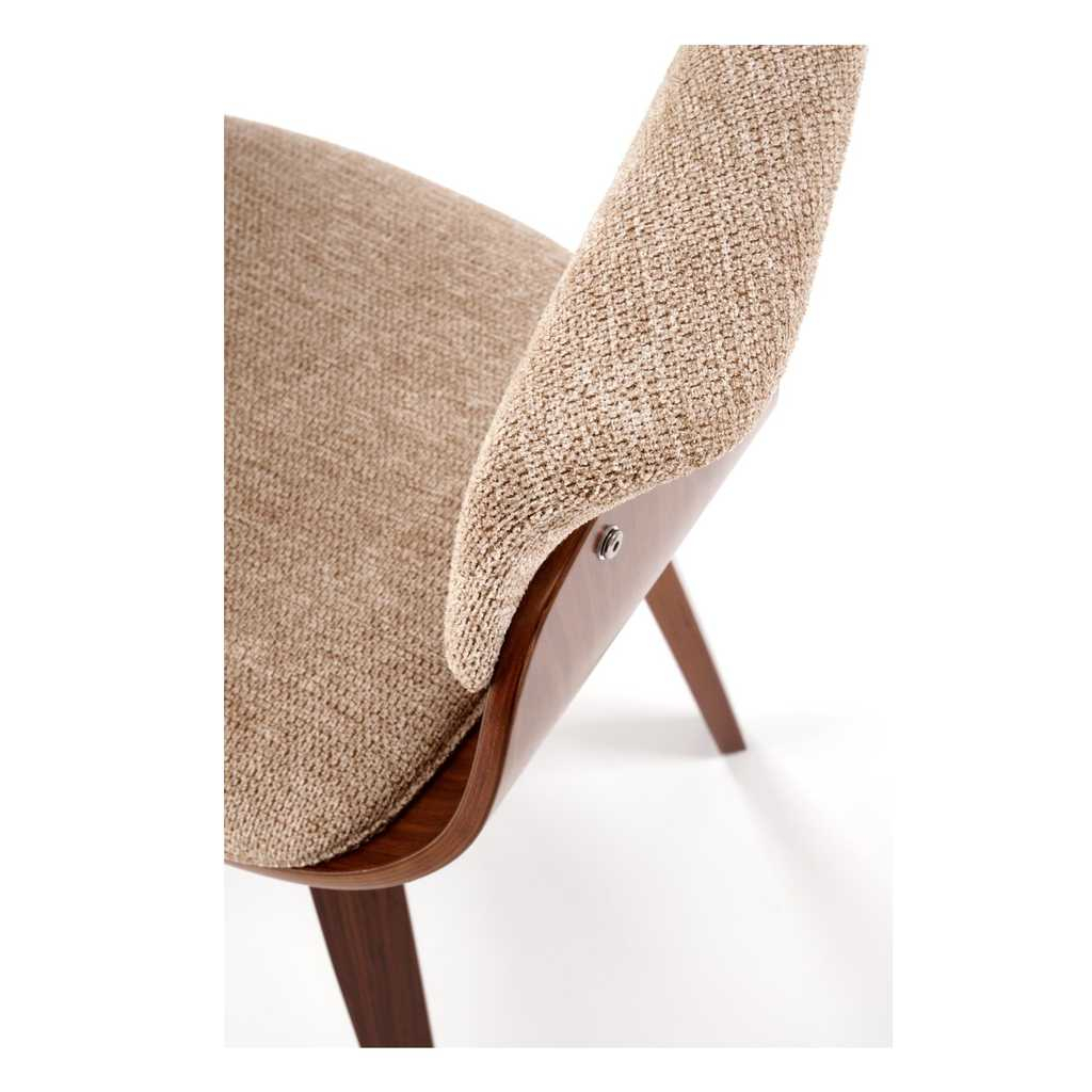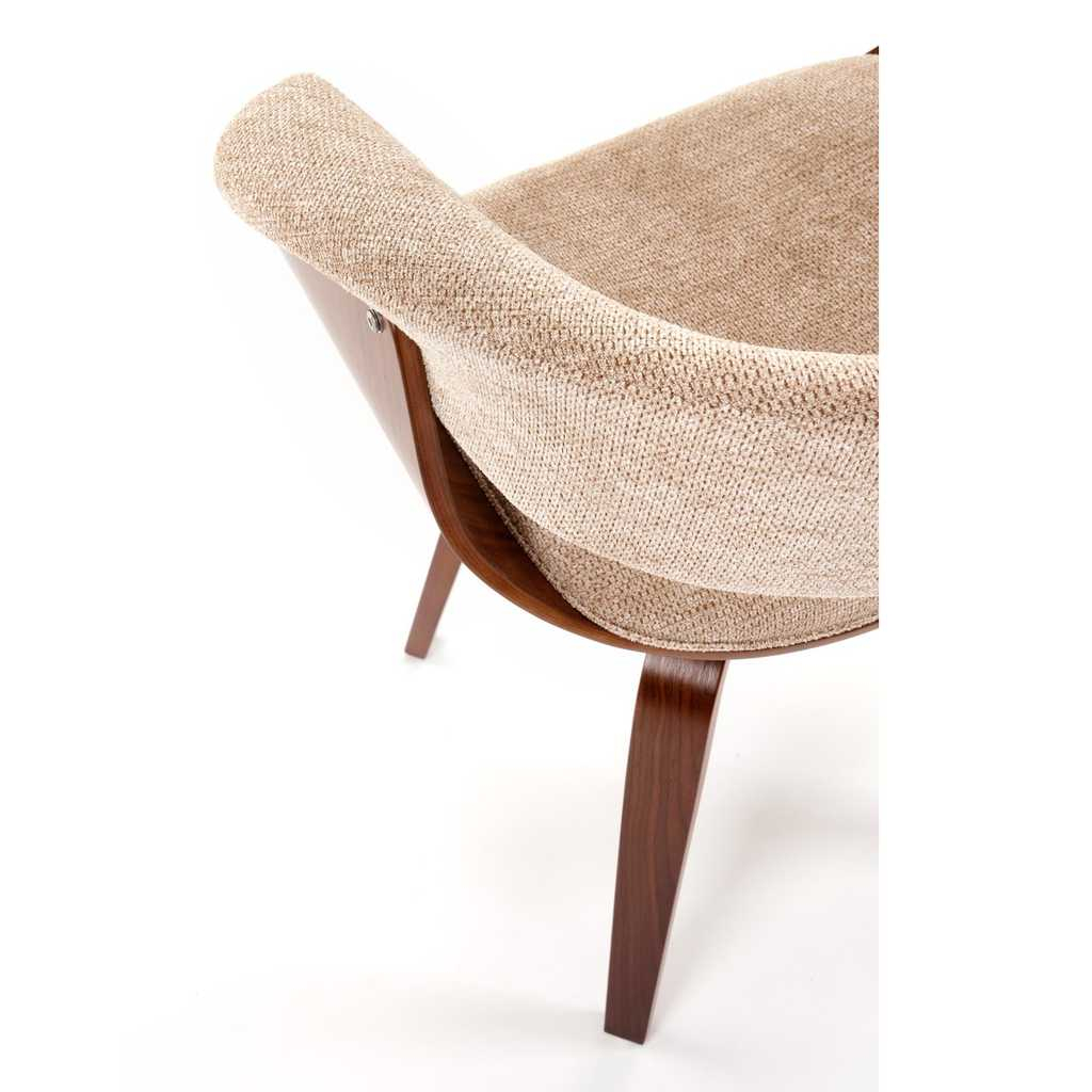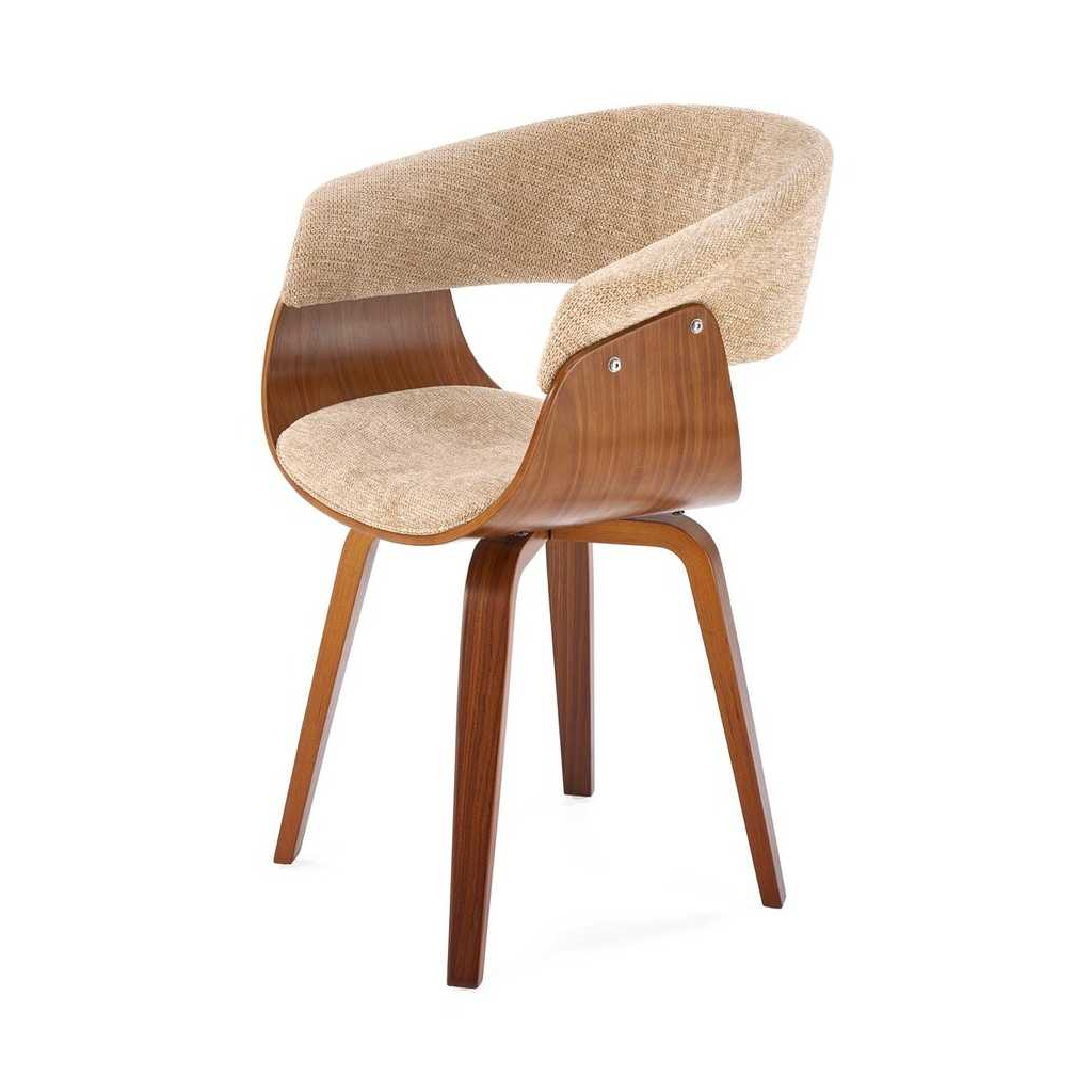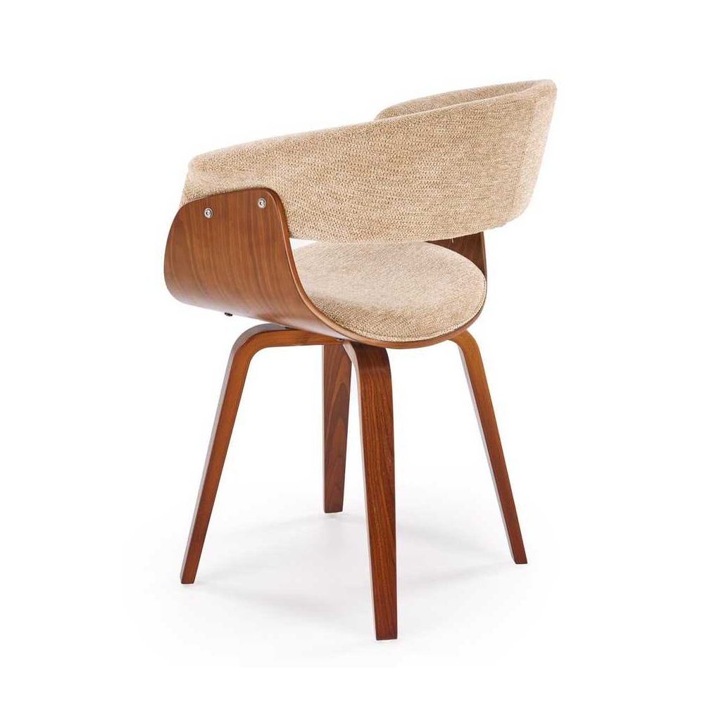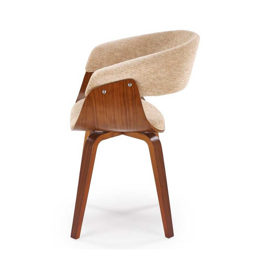 Židle stojí na 4 nohách z ohýbané překližky v tmavém dezénu ořechu, který židli dodává reprezentativní vzhled. Ten dotváří látkový potah, který najdete na sedáku a opěradle.