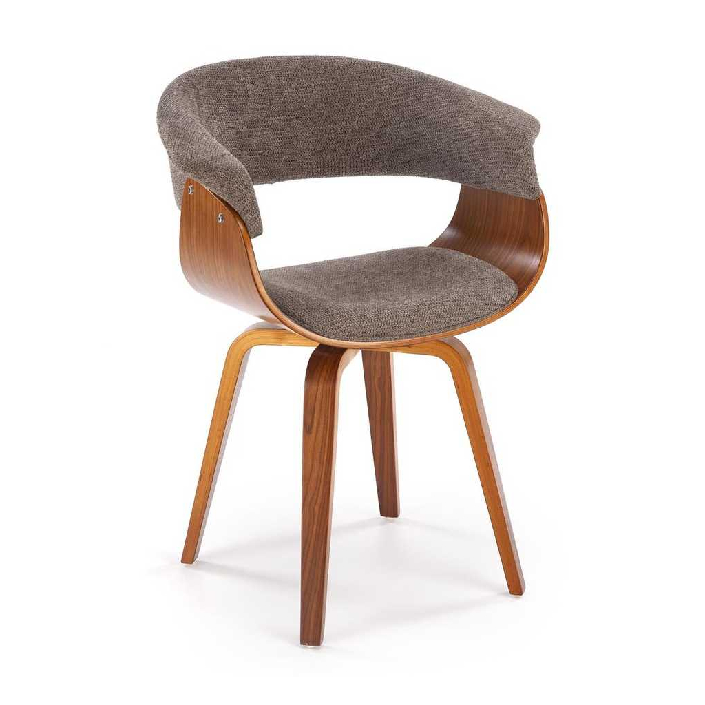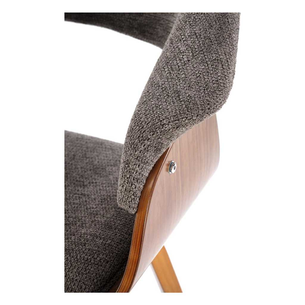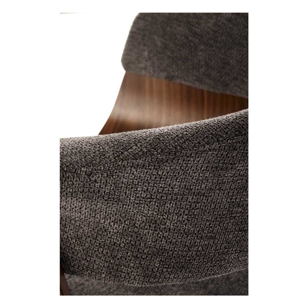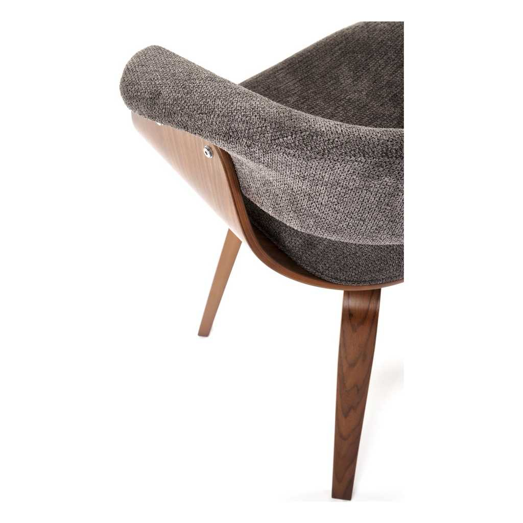 Židle stojí na 4 nohách z ohýbané překližky v tmavém dezénu ořechu, který židli dodává reprezentativní vzhled. Ten dotváří látkový potah, který najdete na sedáku a opěradle.