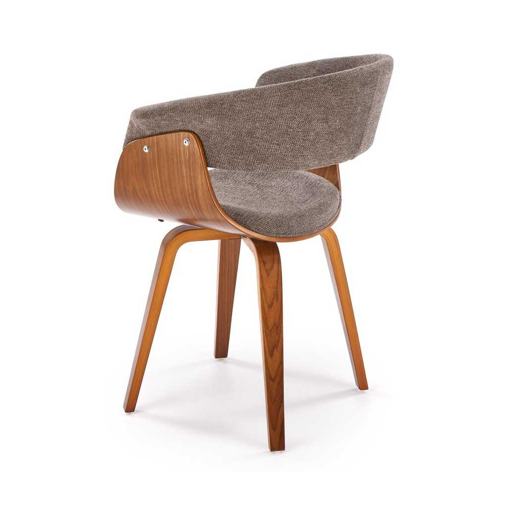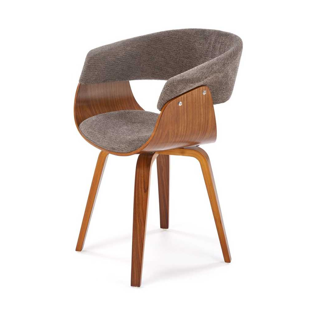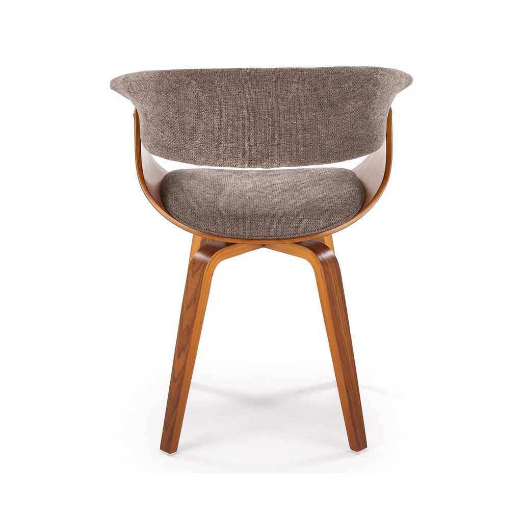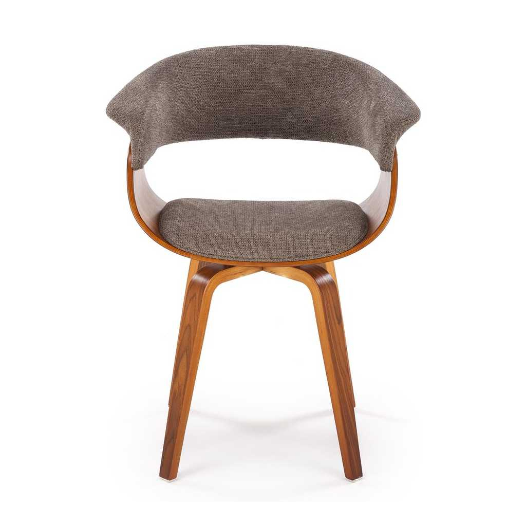 Židle stojí na 4 nohách z ohýbané překližky v tmavém dezénu ořechu, který židli dodává reprezentativní vzhled. Ten dotváří látkový potah, který najdete na sedáku a opěradle.