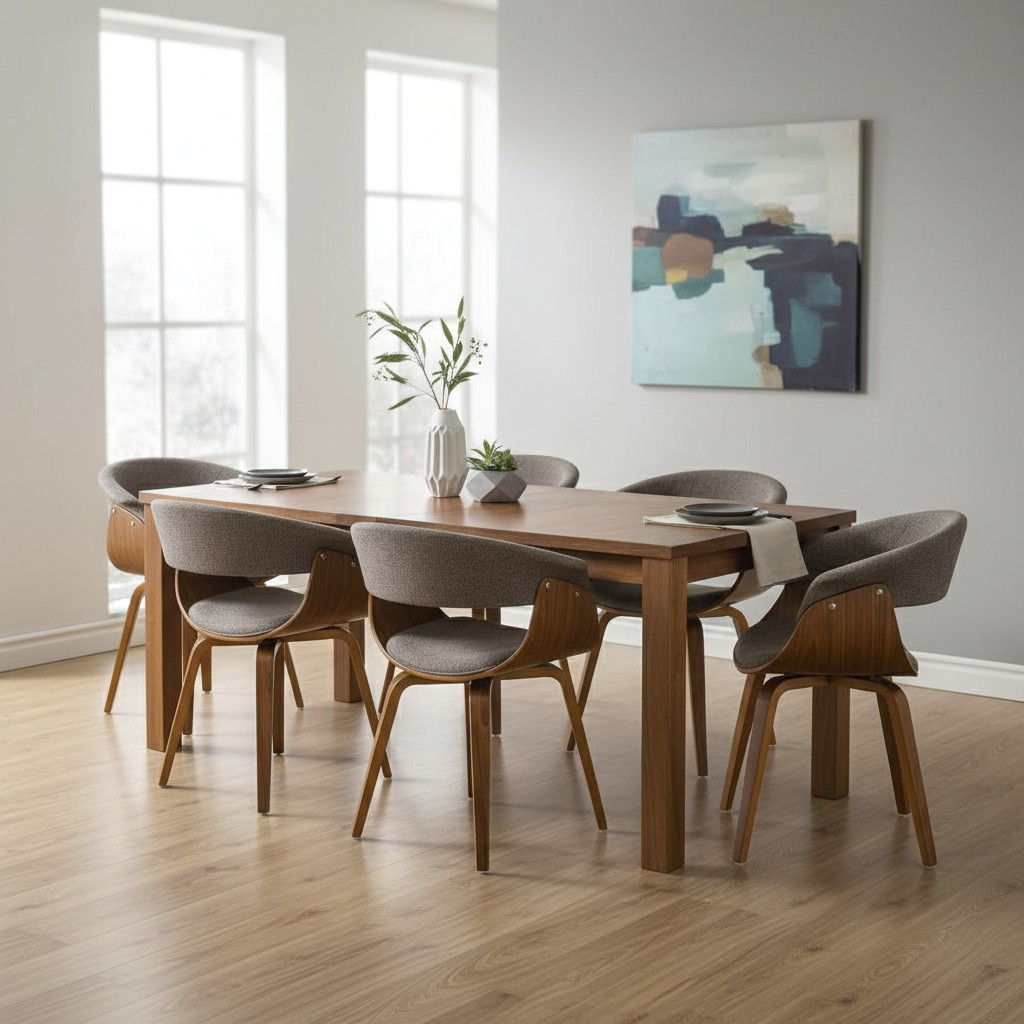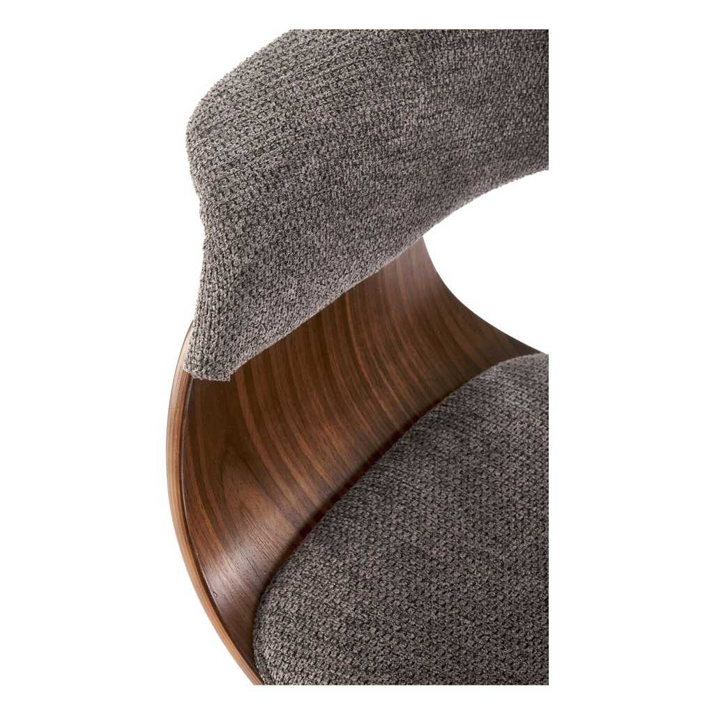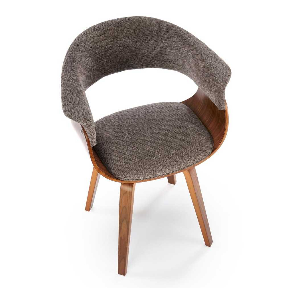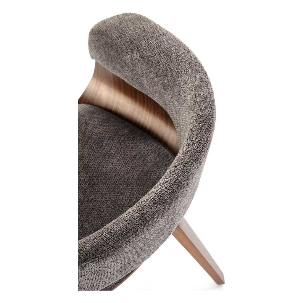 Židle stojí na 4 nohách z ohýbané překližky v tmavém dezénu ořechu, který židli dodává reprezentativní vzhled. Ten dotváří látkový potah, který najdete na sedáku a opěradle.