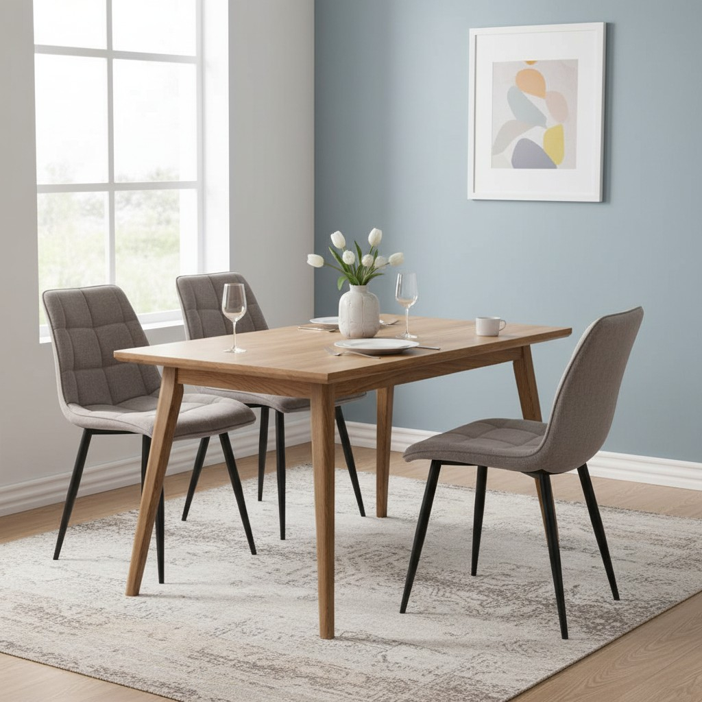 Konstrukce a úzké nohy z kovu dodávají židli stabilitu, zároveň ale působí vzdušně. O efektní vzhled a pohodlí se stará polstrování a potah z hruběji tkané látky. Ta je zvláštní moderním prošíváním.