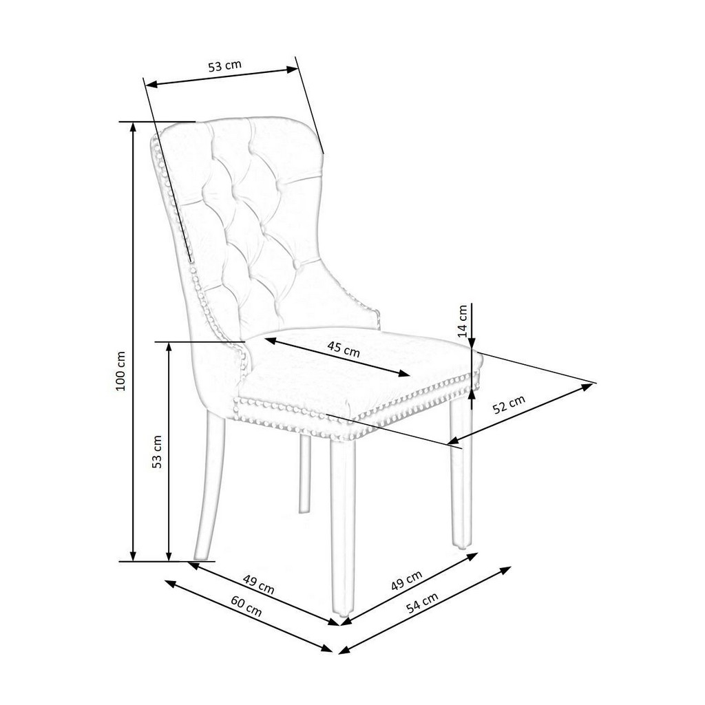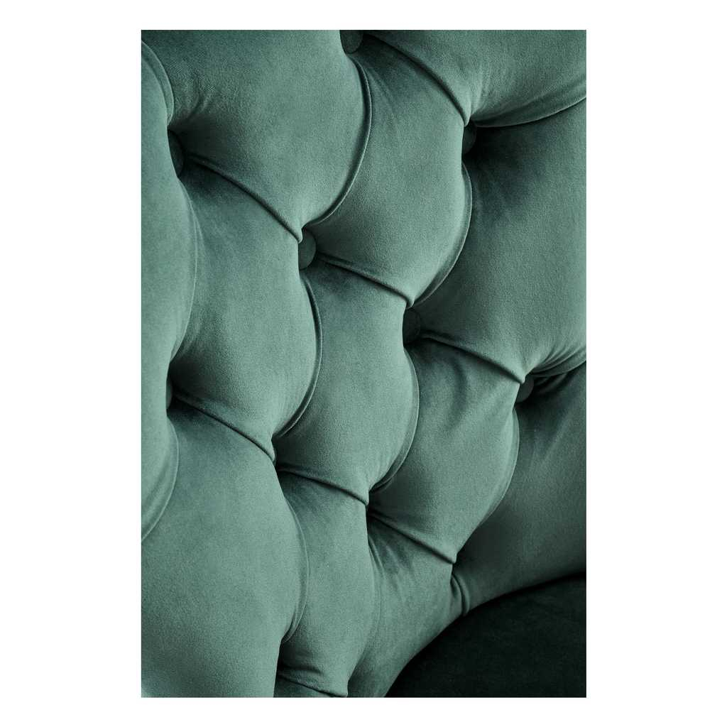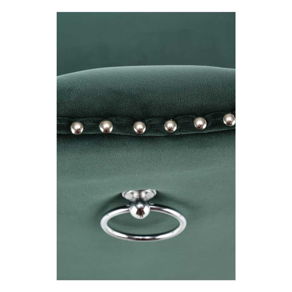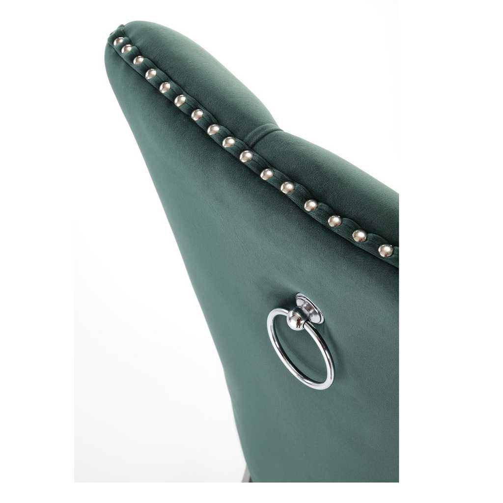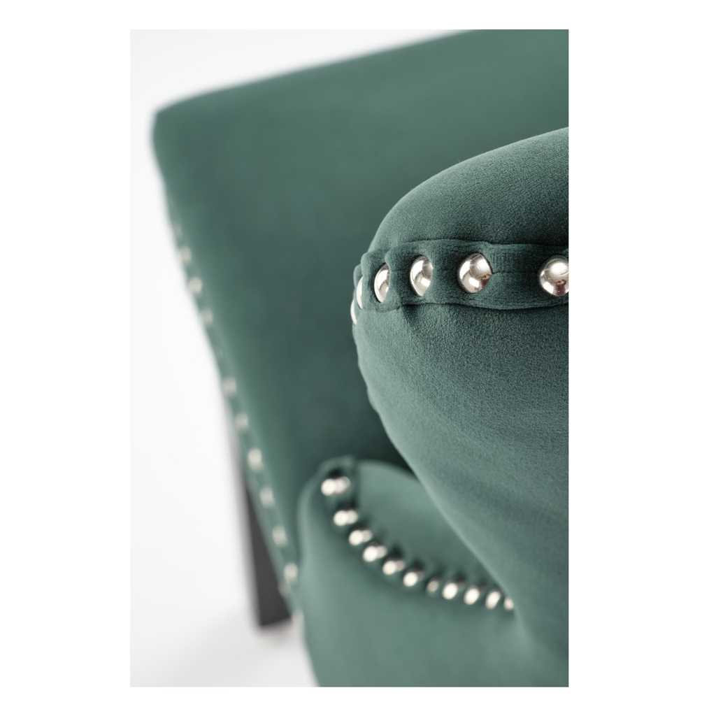Potah je pak ze sametové látky, která židli dodává na prestižnosti. Opěradlo zdobí výrazné prošívání a jeho křivky zvýrazňuje lemování kovovými cvočky.