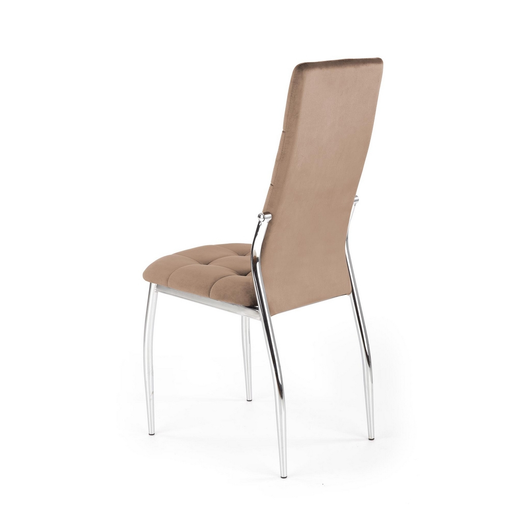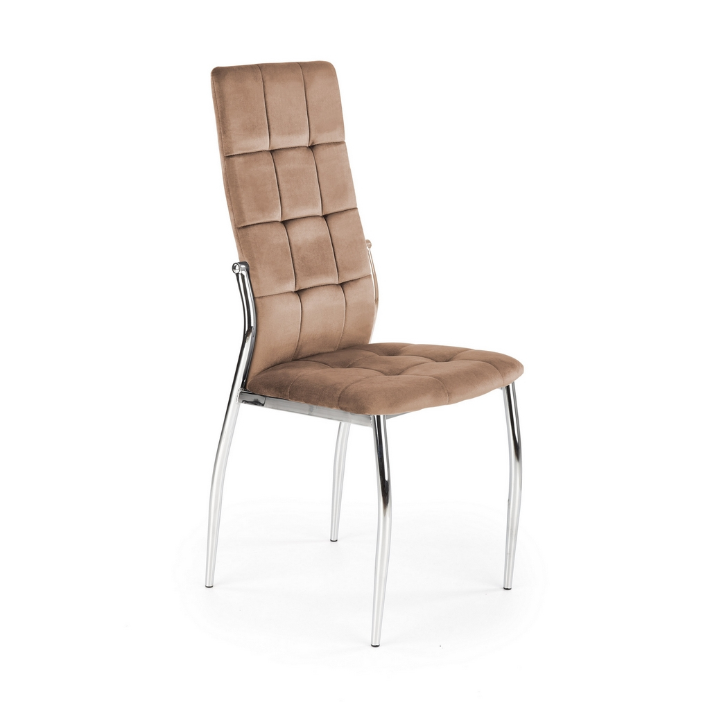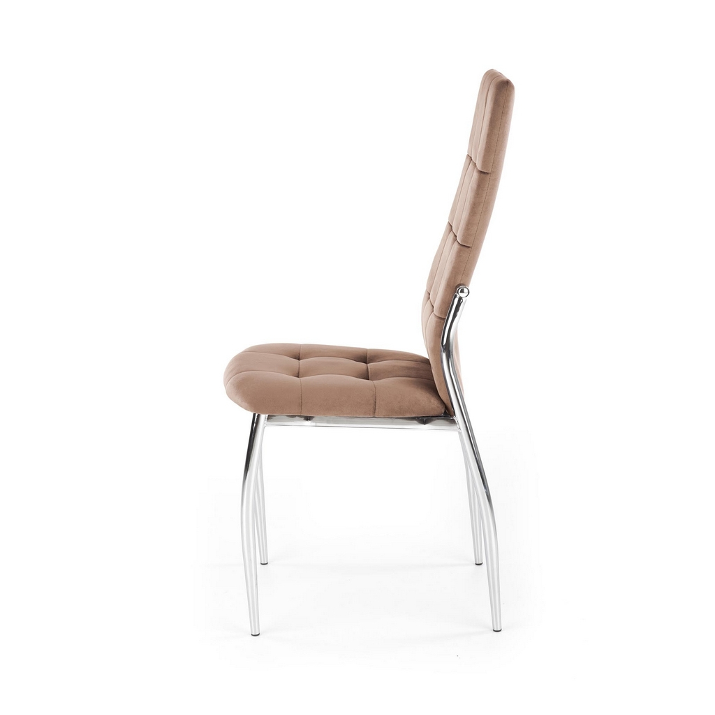 Její luxusní vzhled umocňuje potah ze sametové tkaniny, která je velmi příjemná na omak a na opěráku ještě efektně prošívaná. Polstrovaný sedák poskytne maximální pohodlí. Kovové nohy židli zajistí naprostou stabilitu.
