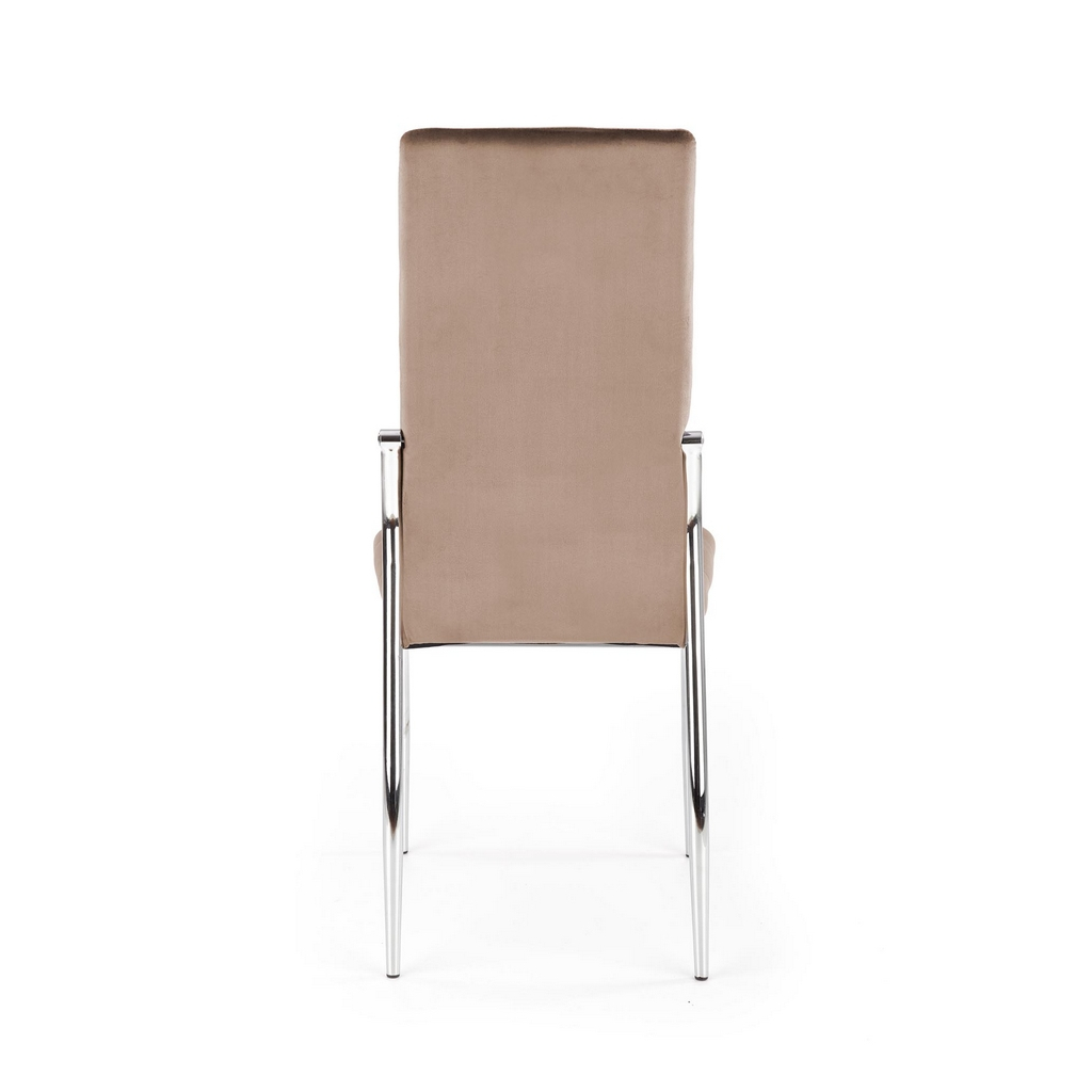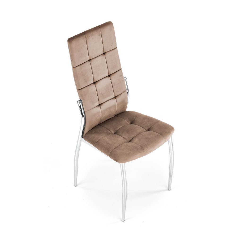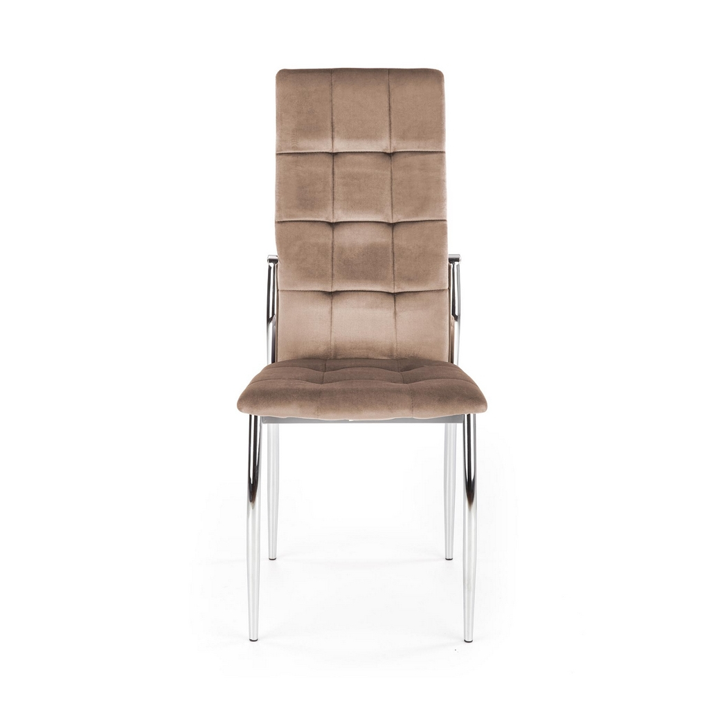 Její luxusní vzhled umocňuje potah ze sametové tkaniny, která je velmi příjemná na omak a na opěráku ještě efektně prošívaná. Polstrovaný sedák poskytne maximální pohodlí. Kovové nohy židli zajistí naprostou stabilitu.