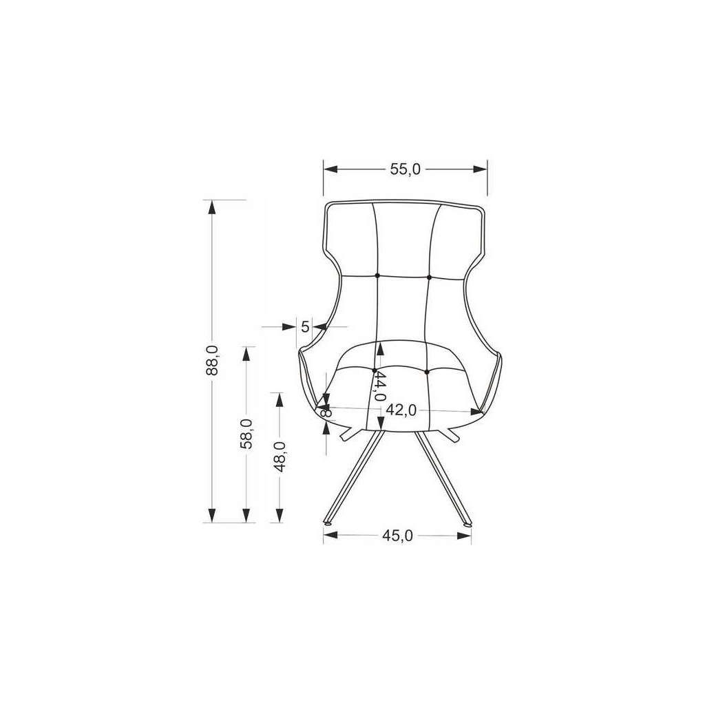 Její rozměry jsou ideální pro běžné využití v domácnosti i kanceláři — šířka 55 cm, hloubka 64 cm a výška 88 cm. Sedák má hloubku 44 cm a výšku sedu od země 48 cm, což přispívá k pohodlnému sezení. Výška opěráku zad 40 cm nabízí dobrou oporu zad.