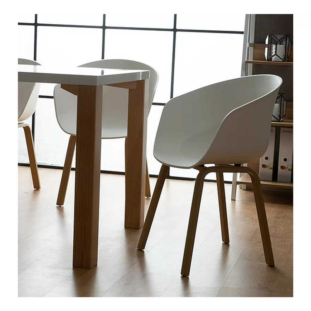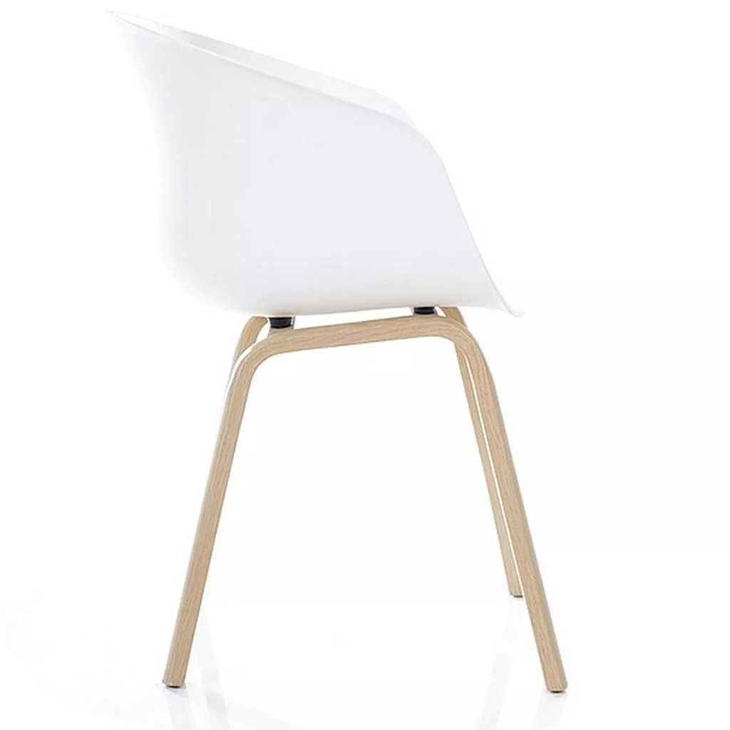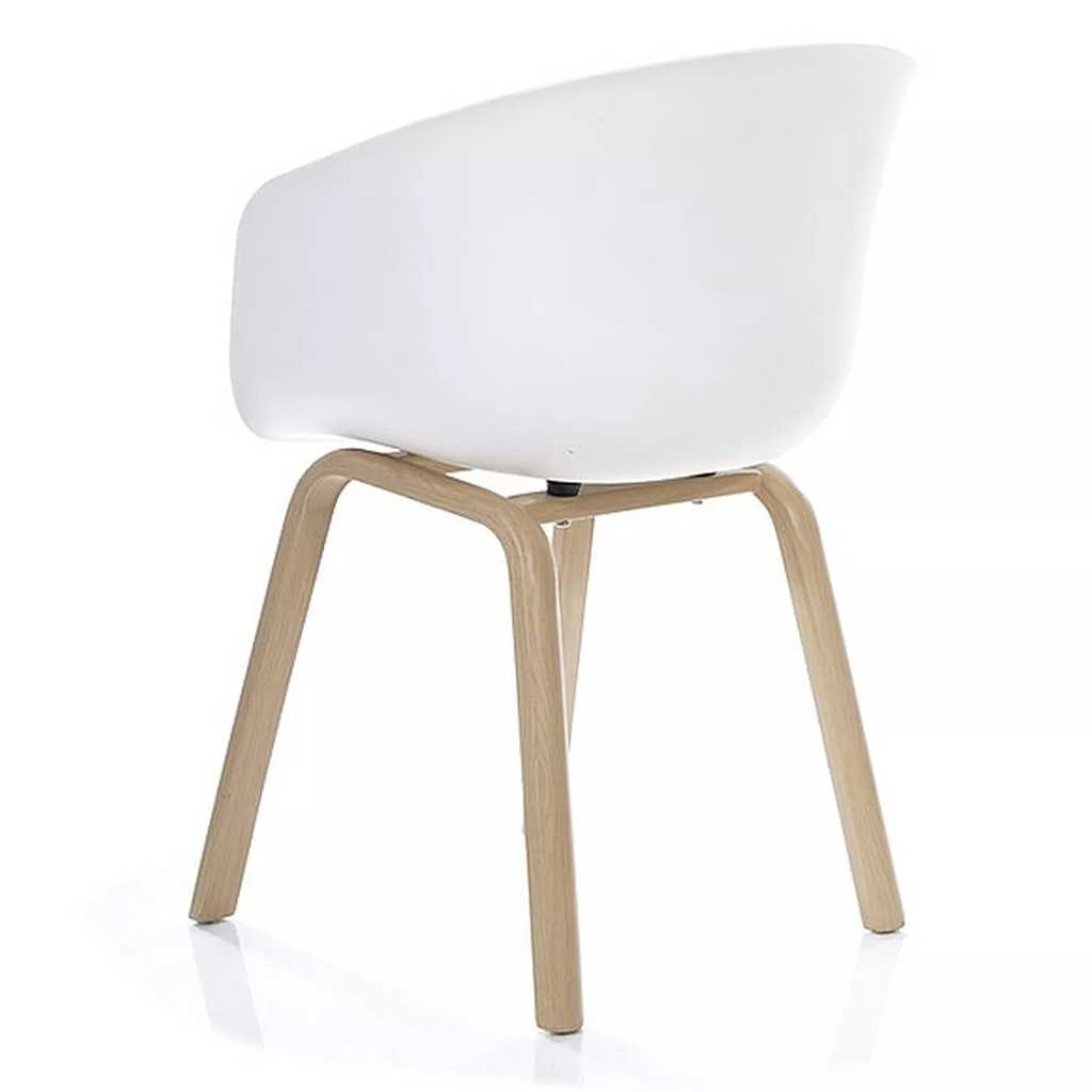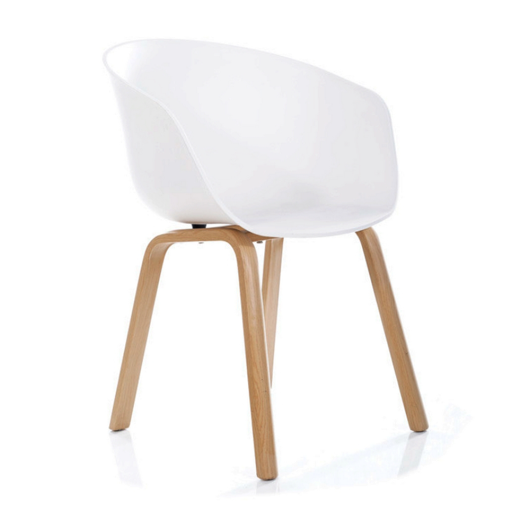 Zaoblený tvar sedáku s integrovanými područkami navíc poskytuje komfort i pažím. Jednoduchý sedák kontrastuje s podnoží. Ta věrně imituje přírodní dřevo.