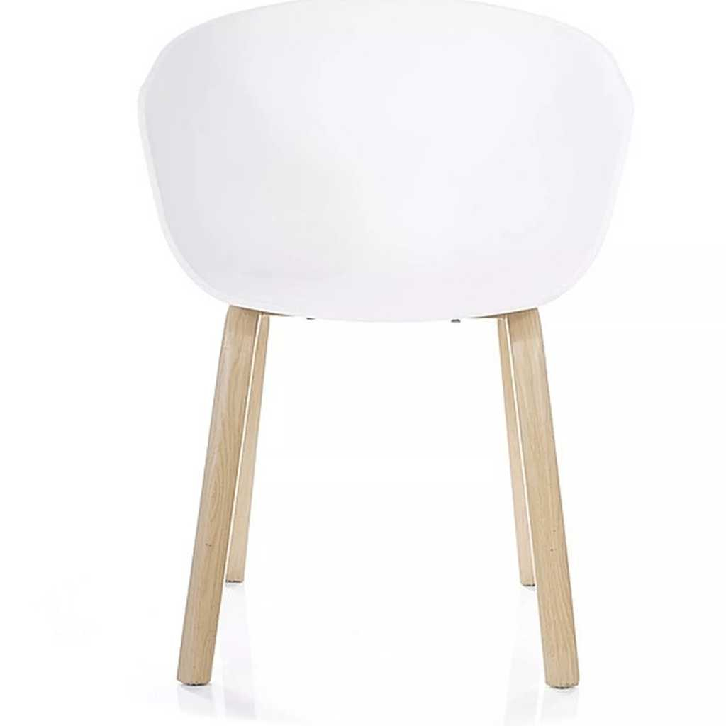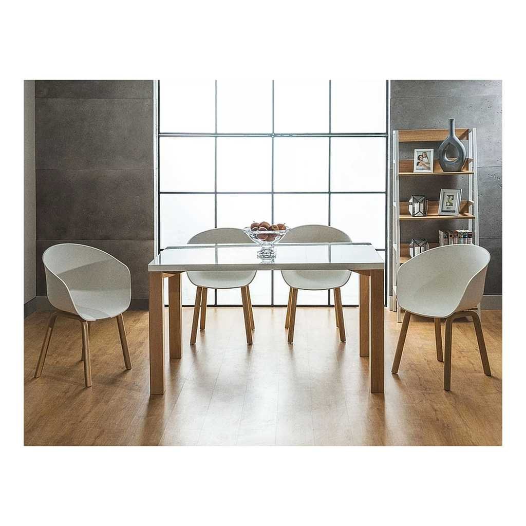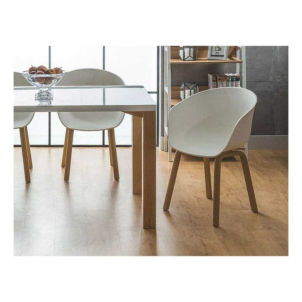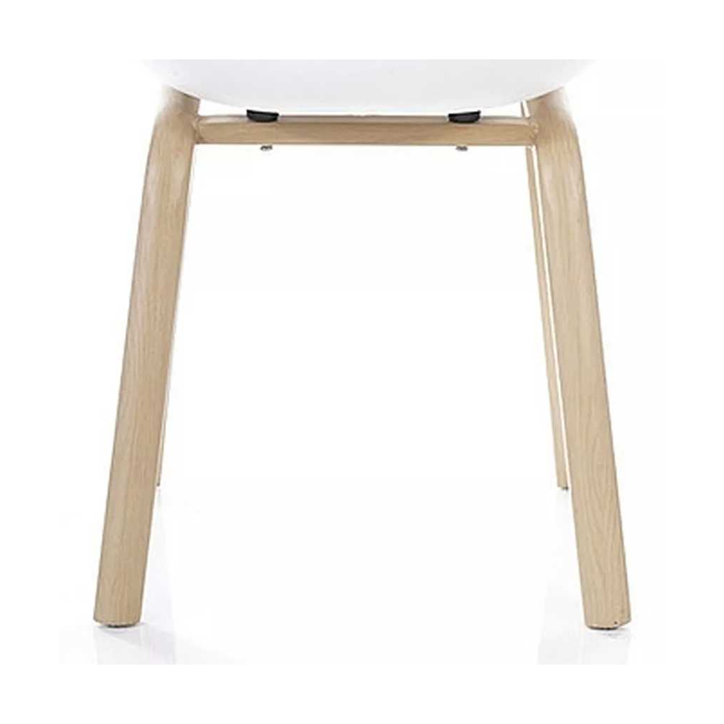 Zaoblený tvar sedáku s integrovanými područkami navíc poskytuje komfort i pažím. Jednoduchý sedák kontrastuje s podnoží. Ta věrně imituje přírodní dřevo.