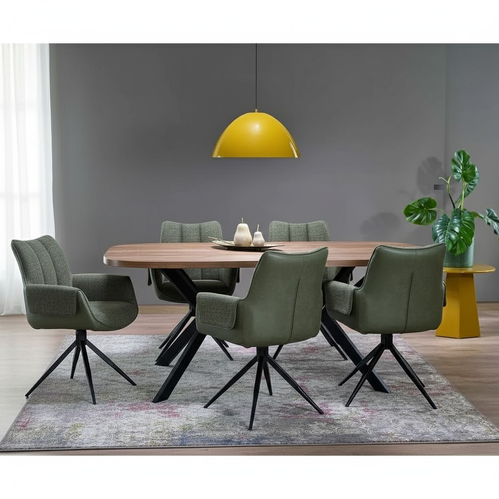 Jídelní židle Mindy nabízí komfortní posezení díky kombinaci materiálů – kůže a látky – které zajišťují příjemný pocit a odolnost. Robustní kovová podnož poskytuje stabilitu a dlouhou životnost, přičemž nosnost židle je až 120 kg. Ideální volba pro moderní jídelny, kde oceníte spojení praktičnosti a elegantního designu.