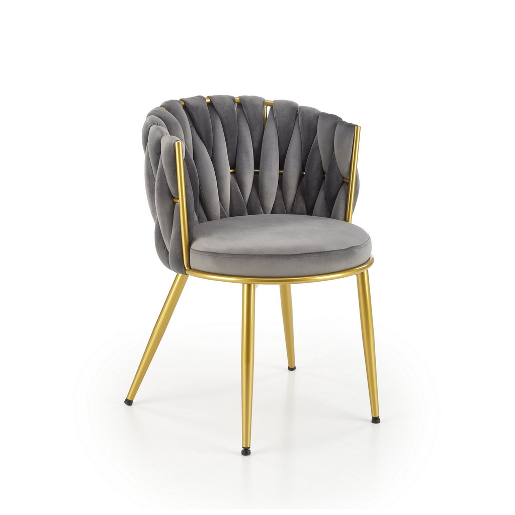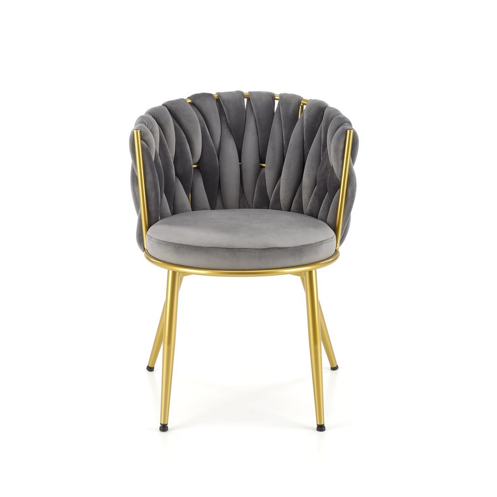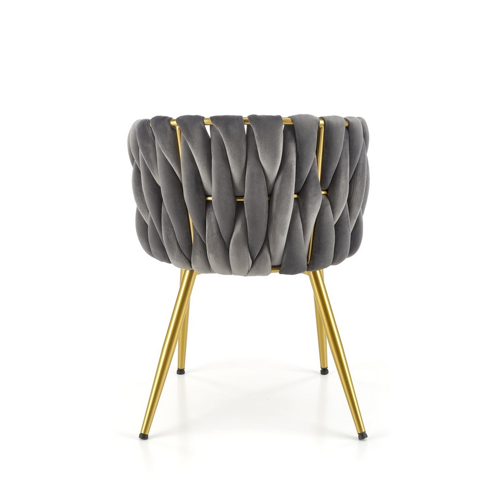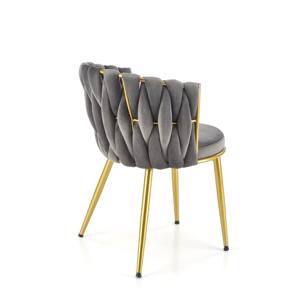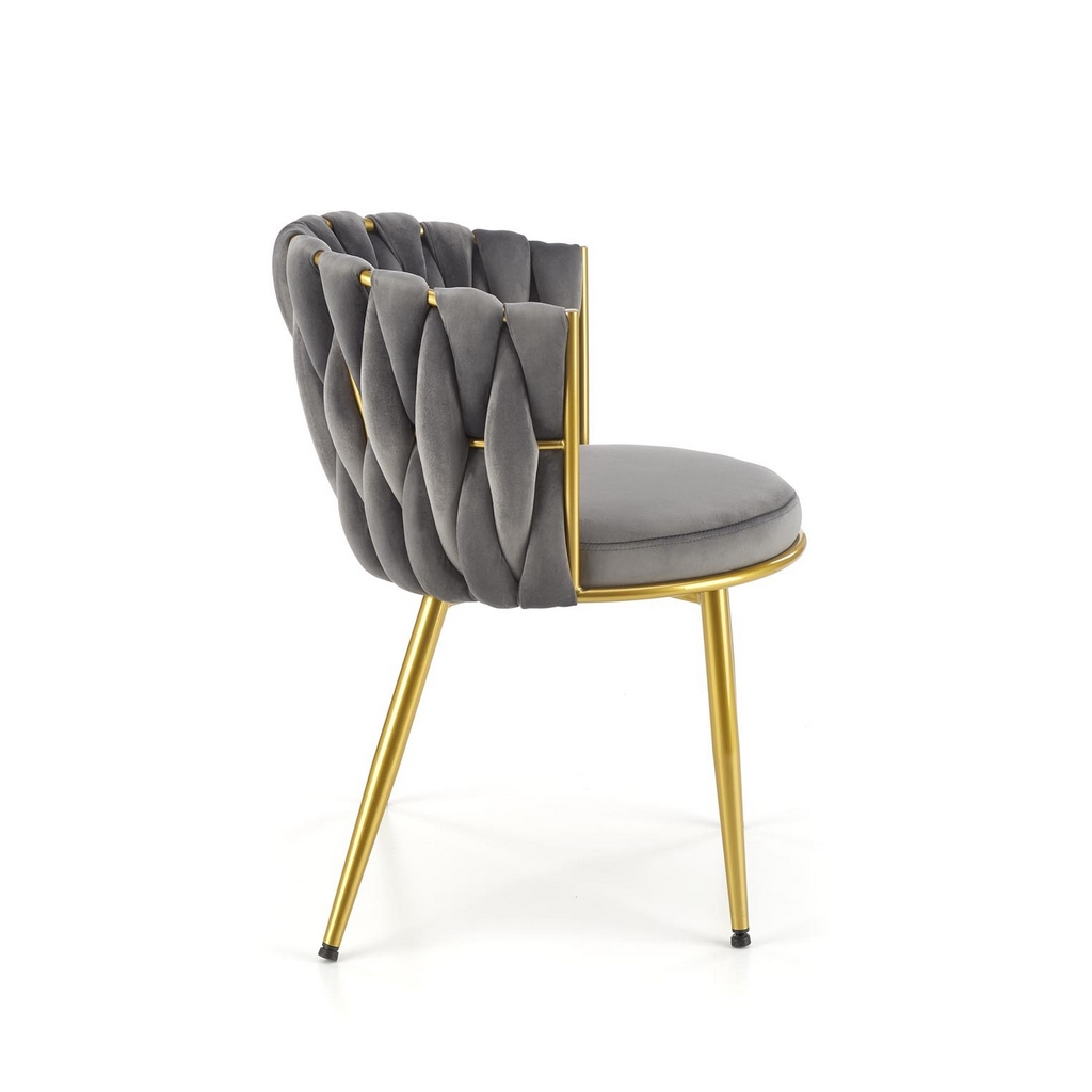 Sedák i opěradlo jsou potažené látkou. U opěráku má čalounění podobu pruhů propletených mezi výztuhami – ty jsou stejně jako nohy židle z práškované ocele ve zlatém lesku.