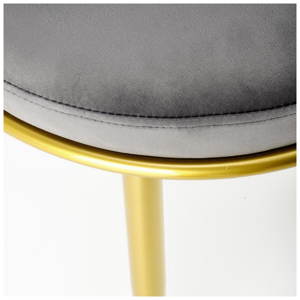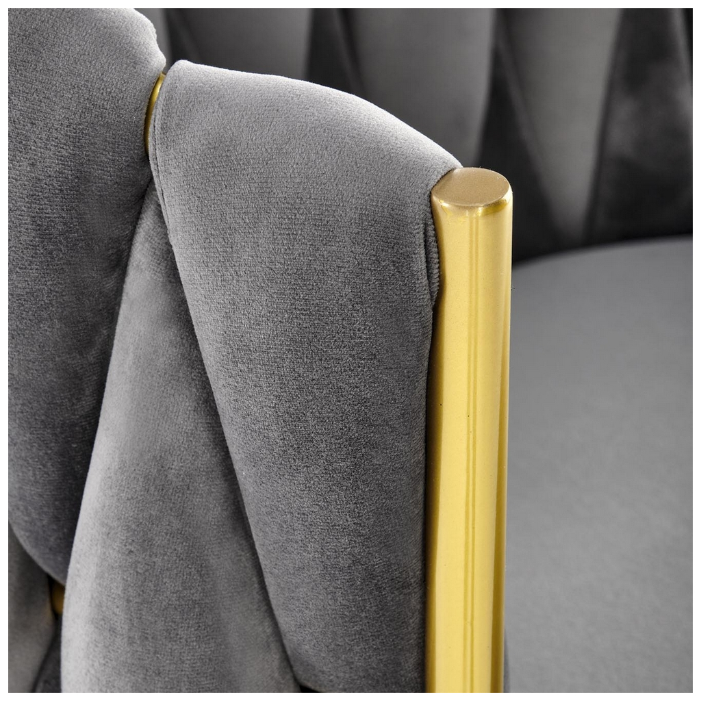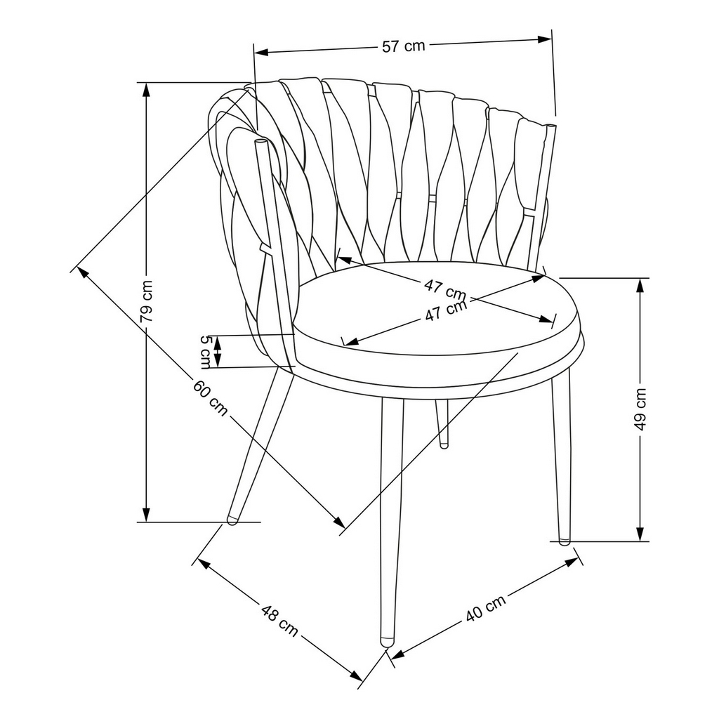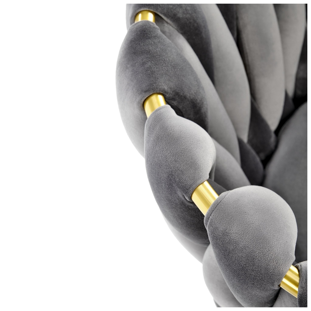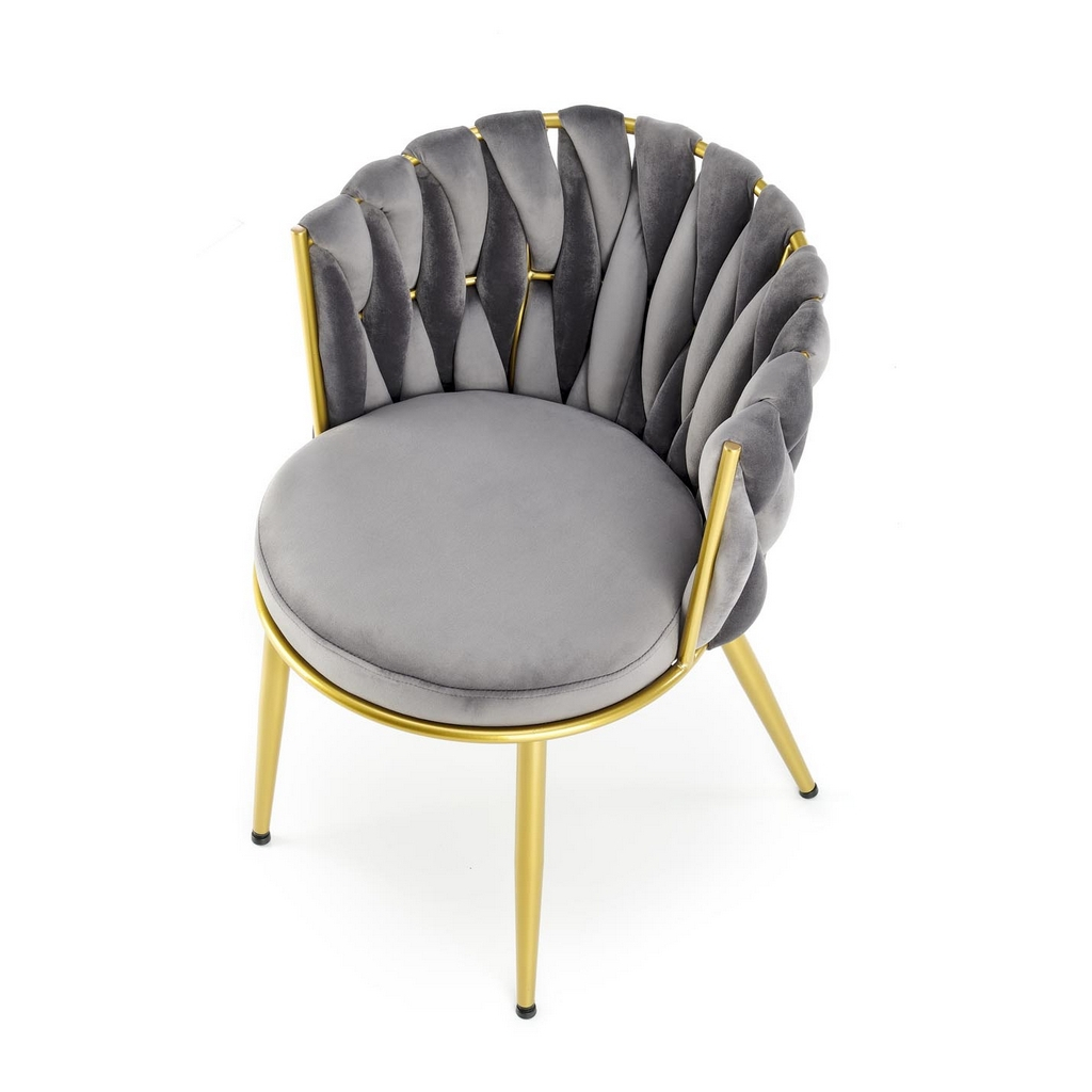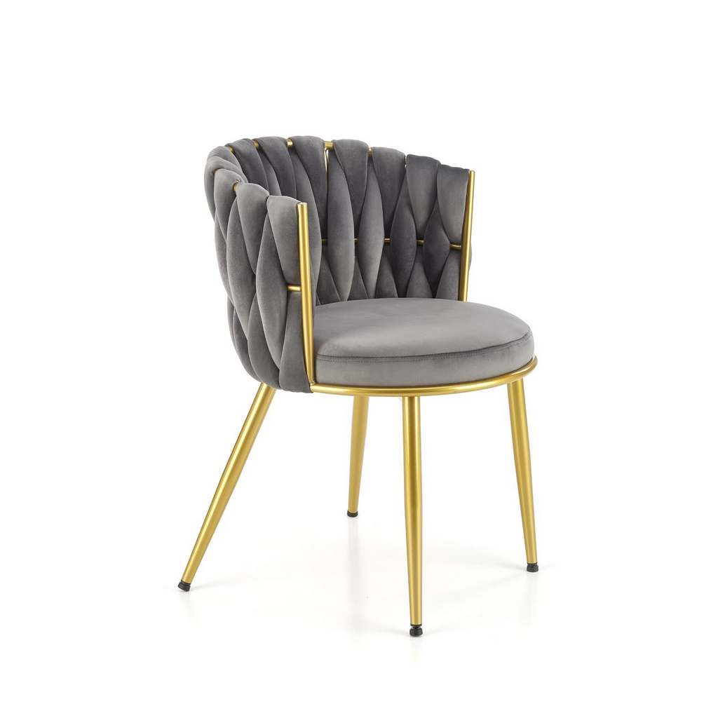 Sedák i opěradlo jsou potažené látkou. U opěráku má čalounění podobu pruhů propletených mezi výztuhami – ty jsou stejně jako nohy židle z práškované ocele ve zlatém lesku.