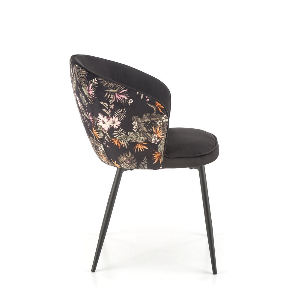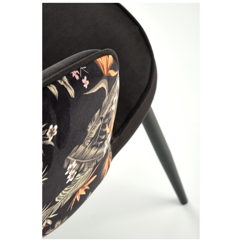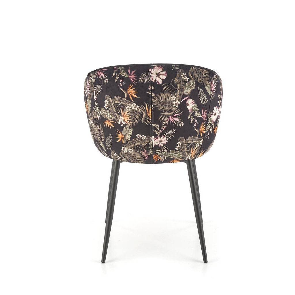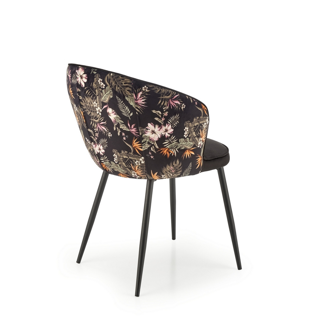 Sedák i opěradlo jsou čalouněné hebkou látkou podobnou sametu. Zadní stranu zdobí barevný květinový motiv.