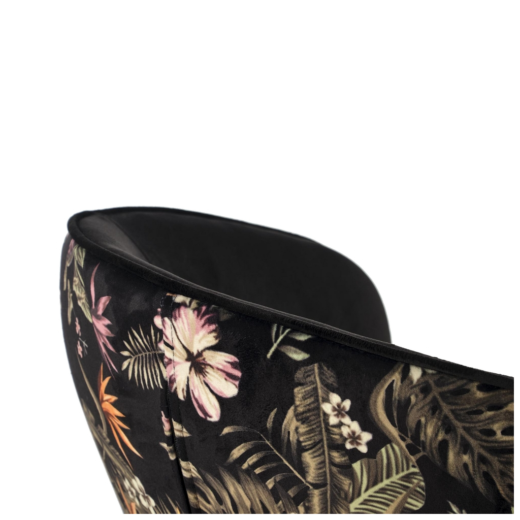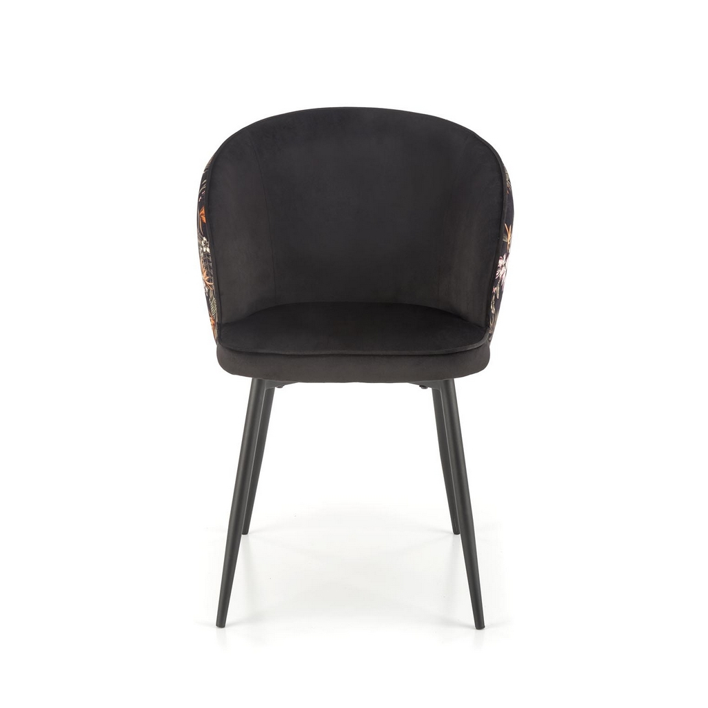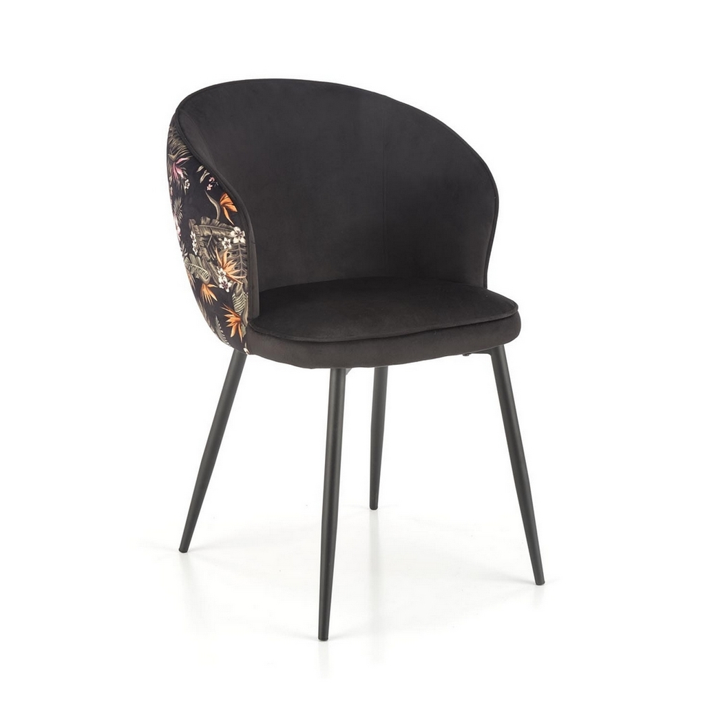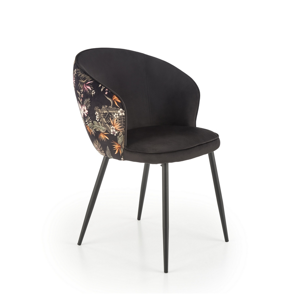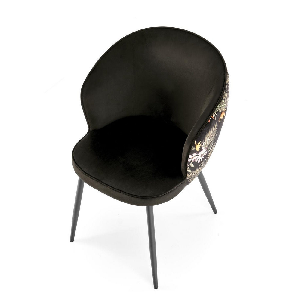 Sedák i opěradlo jsou čalouněné hebkou látkou podobnou sametu. Zadní stranu zdobí barevný květinový motiv.