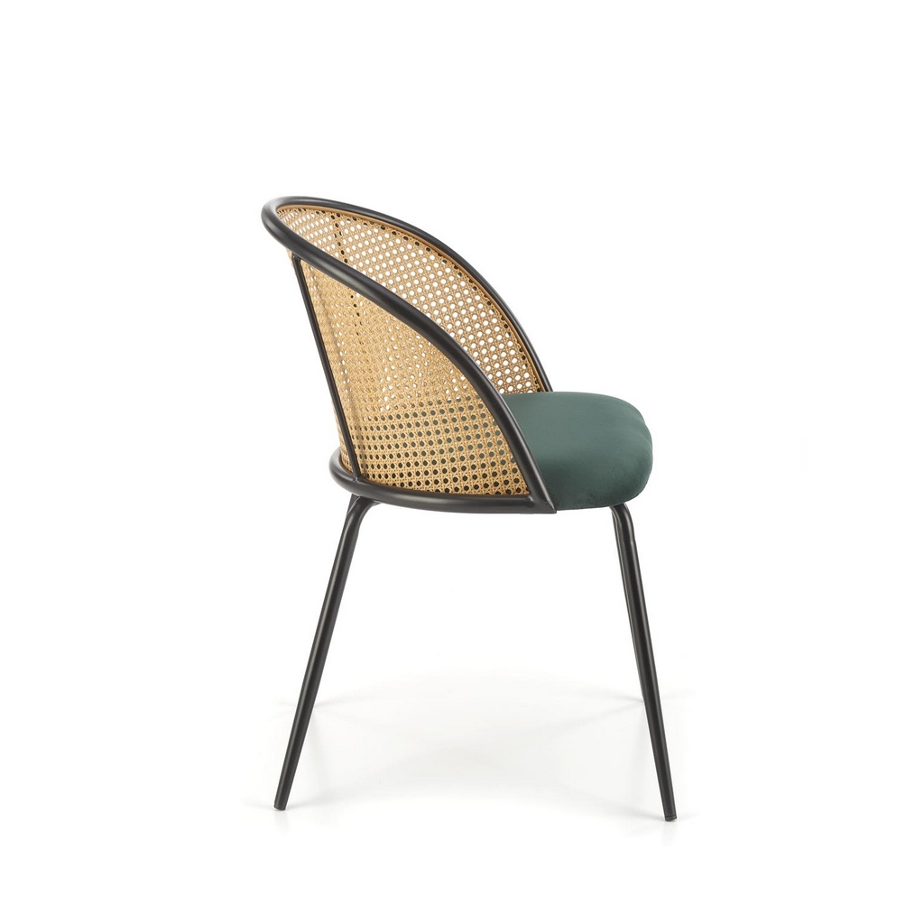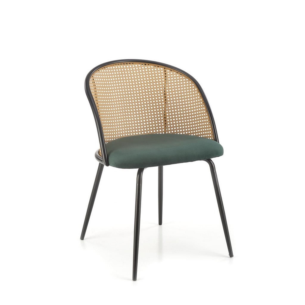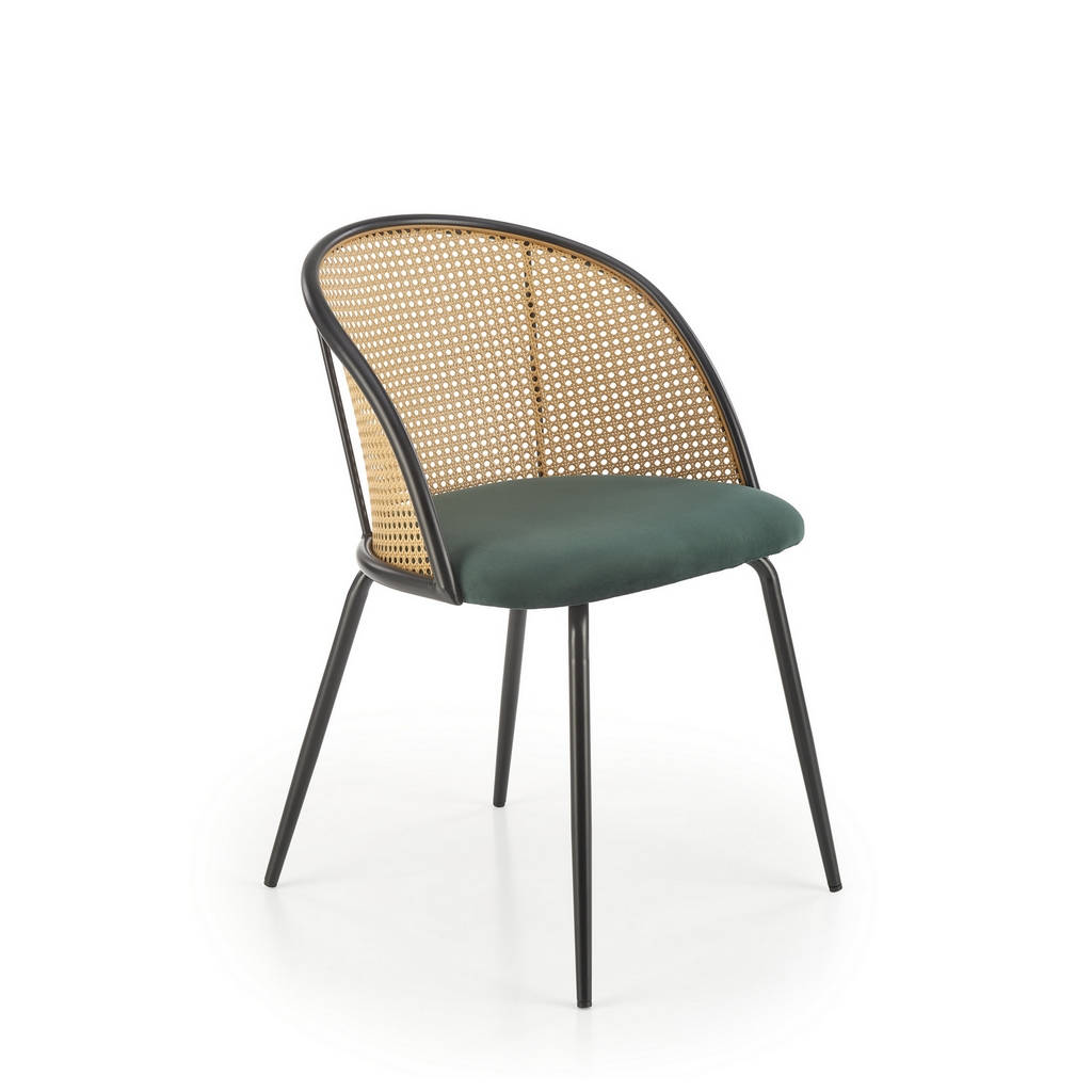 Sedák je čalouněný heboučkou látkou podobnou sametu, opěradlo je pak vypletené umělým ratanem.