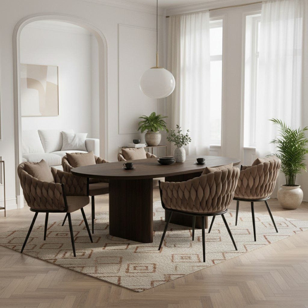 Na první pohled židle zaujme svým netradičním vzhledem. Dominuje proplétaná opěrka po obvodu celého sedáku. Symetrický podsedák je stejně jako polstrování opěrné části a polštář potažený sametově hebkou látkou.