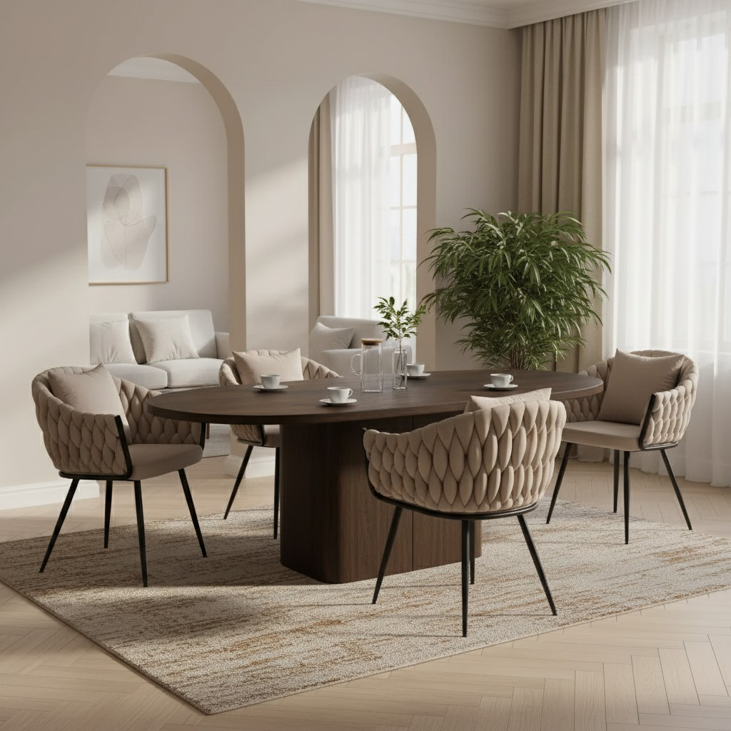 Na první pohled židle zaujme svým netradičním vzhledem. Dominuje proplétaná opěrka po obvodu celého sedáku. Symetrický podsedák je stejně jako polstrování opěrné části a polštář potažený sametově hebkou látkou.